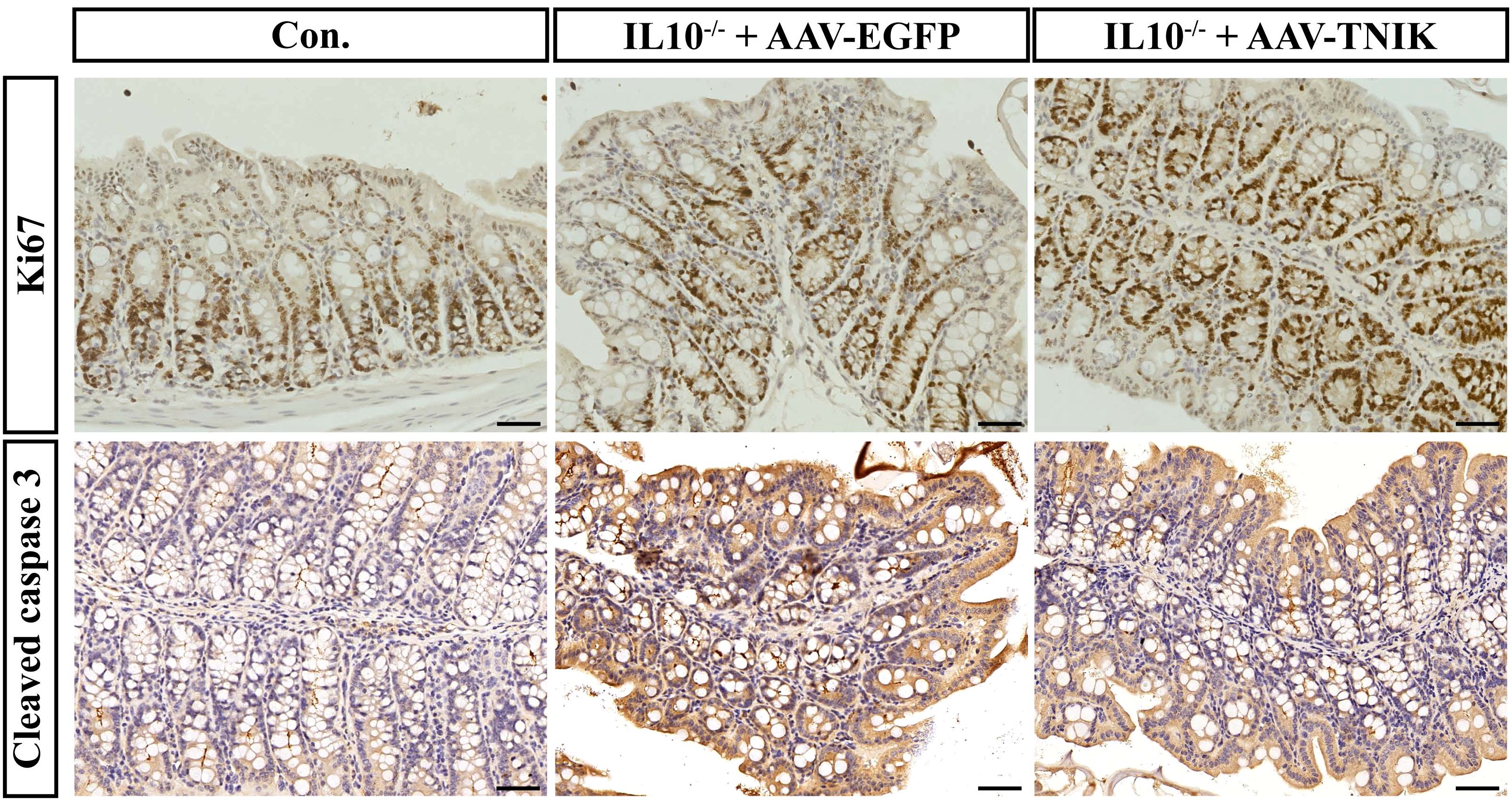 Figure 10. TNIK promotes colonic epithelial cell proliferation and ameliorates apoptosis imbalance. The IHC staining results of mouse colonic tissues showing the expression of Ki67 (top row) and Cleaved caspase-3 (bottom row). Scale bars, 50 µm.