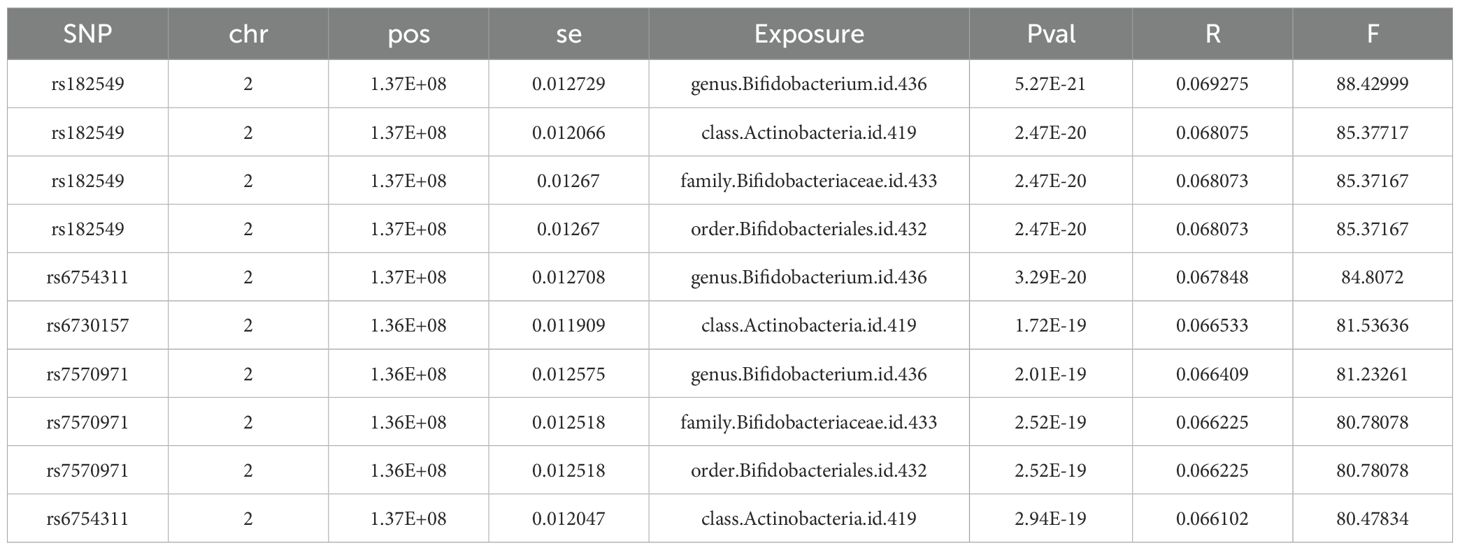 In accordance with the methodology described above, a total of 965 SNPs were obtained, all of which showed F-statistics > 10, indicating no weak instrument bias. These selected SNPs met the relevance assumption required for MR analysis. Only the top 10 SNPs, ranked by F-statistics, are presented in Table 1, while the full list is provided in Supplementary Table 1.