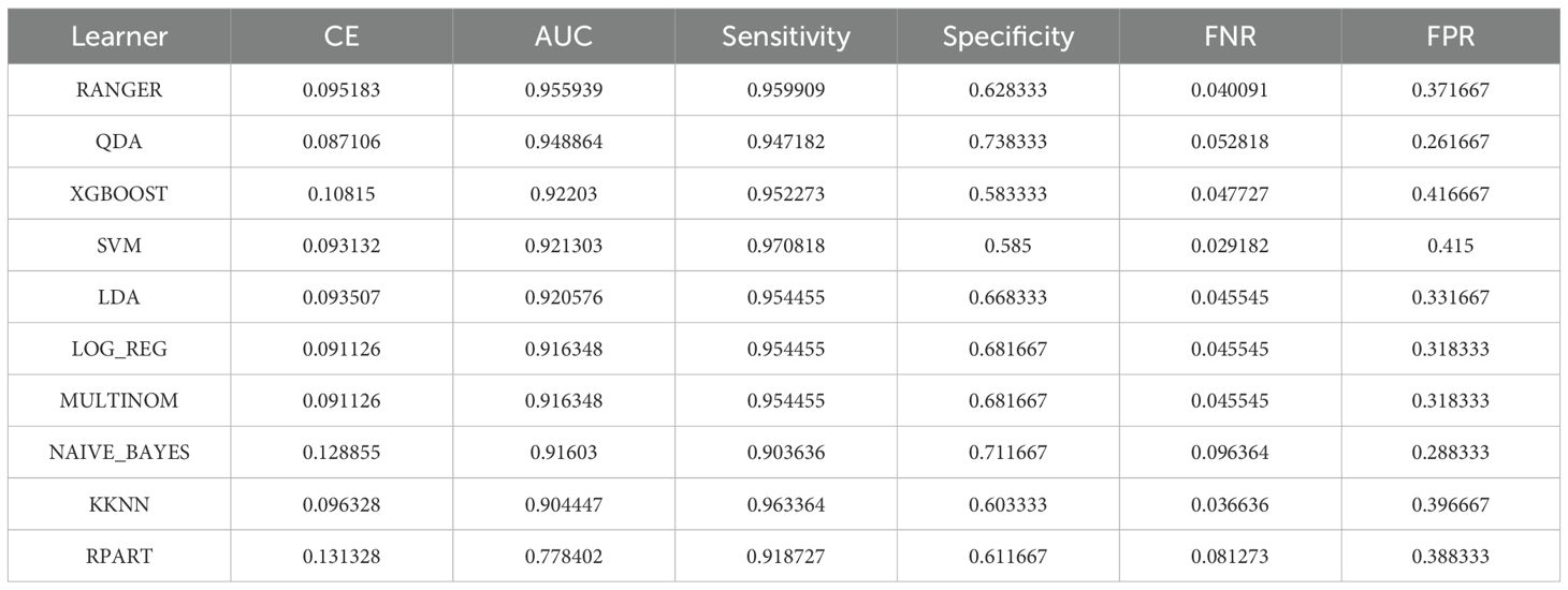 The mlr3 (v0.22.1.9000) R package was employed to construct an ensemble machine learning model, in which ten distinct algorithms were integrated for training and evaluation. Subsequently, the pROC (v1.18.5) package was used to generate ROC curves and compute area under the curve (AUC) values, enabling the identification of optimal-performing models for candidate gene analysis and key gene selection. To assess model stability, 10 repetitions of 10-fold cross-validation were performed. ROC curves were plotted for each model, and the mean AUC values from repeated cross-validation were reported. For each model, the AUC, sensitivity, and specificity values were recorded. Models with all metrics > 0.8 and AUC ≠ 1 were considered stable and well-performing and were designated as “optimal models.”. Genes retained in the optimal models were defined as feature genes. To assess the clinical relevance of the key genes, Spearman correlation analysis was performed using the psych (v2.4.12) package on the GSE92415 dataset, evaluating their relationship with the Mayo score. Correlations with |cor| > 0.3 and P < 0.05 were considered statistically meaningful. Finally, the key genes expressions were validated across the GSE87473 and GSE75214 datasets using the Wilcoxon rank-sum test to ensure consistent differential expression trends.