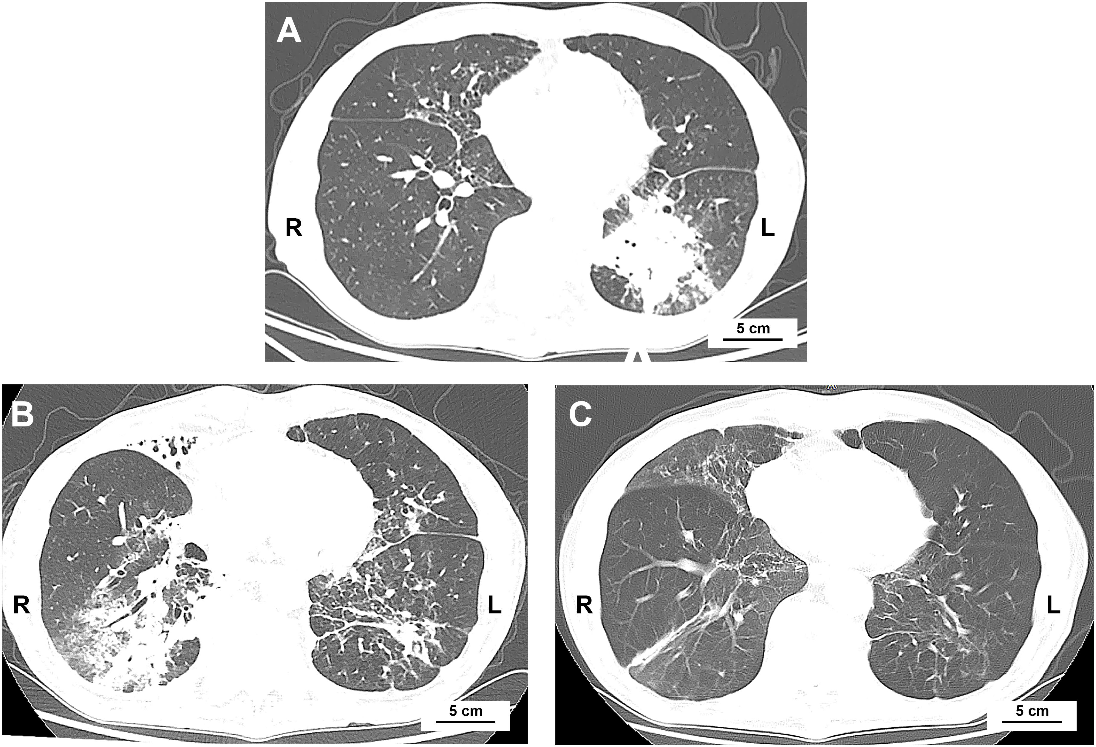 A 74-year-old man with ES-SCLC was treated with etoposide plus carboplatin, with atezolizumab (1200 mg) added in the second cycle after being withheld in the first due to poor condition. The baseline chest CT scan is shown in Figure 1A, and the overall clinical timeline is presented in Figure 2. Post-second cycle evaluation showed partial remission with significant reduction of the left hilar lesion and liver metastases; brain imaging revealed resolution of metastases, while chest CT indicated more patchy consolidations in both lungs. After the third chemotherapy cycle, the patient returned with increased bilateral linear consolidations on chest CT (Figure 1B), raising concern for ICI-related pneumonitis. He had a 50-year history of smoking five cigarettes daily, prior radiation and chemotherapy for pharyngeal lymphoma, and radiographic features suggestive of ankylosing spondylitis, while without inflammatory back pain or other symptoms of autoimmune diseases.