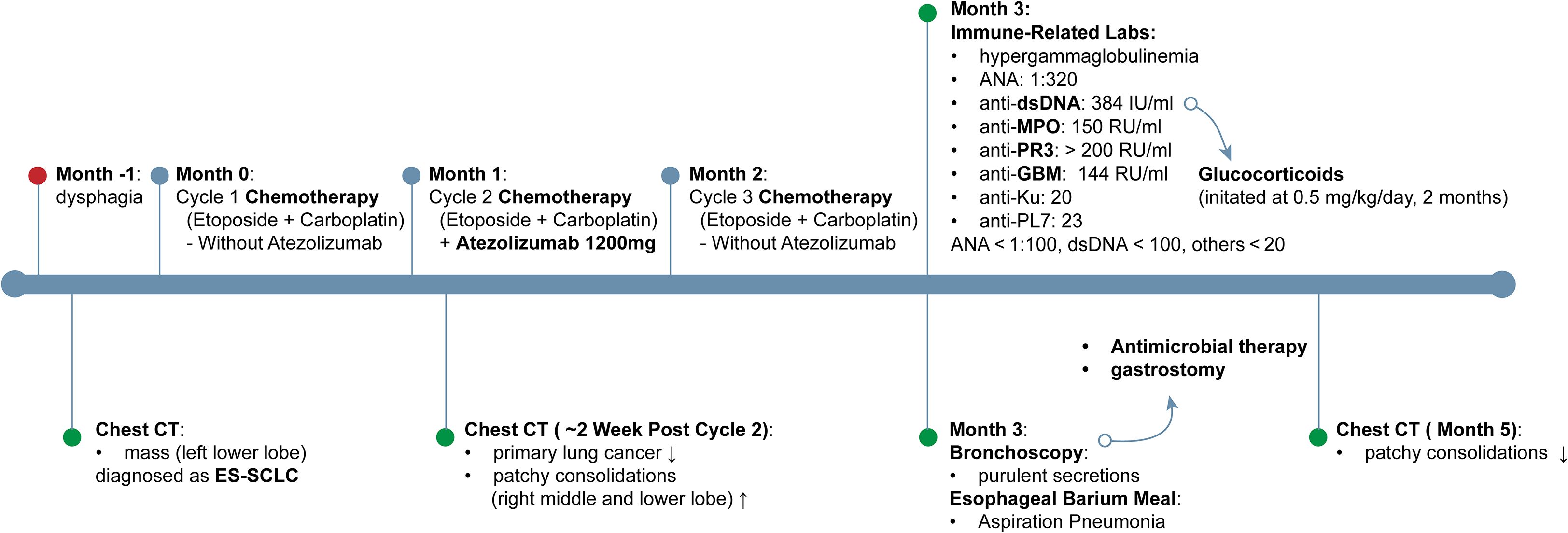 Figure 2. Timeline of clinical course and interventions. Timeline depicting clinical course from one month prior to diagnosis through month 5, outlining symptom onset, imaging changes on chest CT, chemotherapy regimens ± atezolizumab, immune−related laboratory findings, and principal therapeutic interventions. dsDNA, double-stranded DNA; ES-SCLC, extensive-stage small cell lung cancer; GBM, glomerular basement membrane; MPO, myeloperoxidase-antineutrophil cytoplasmic; PR3, proteinase 3.