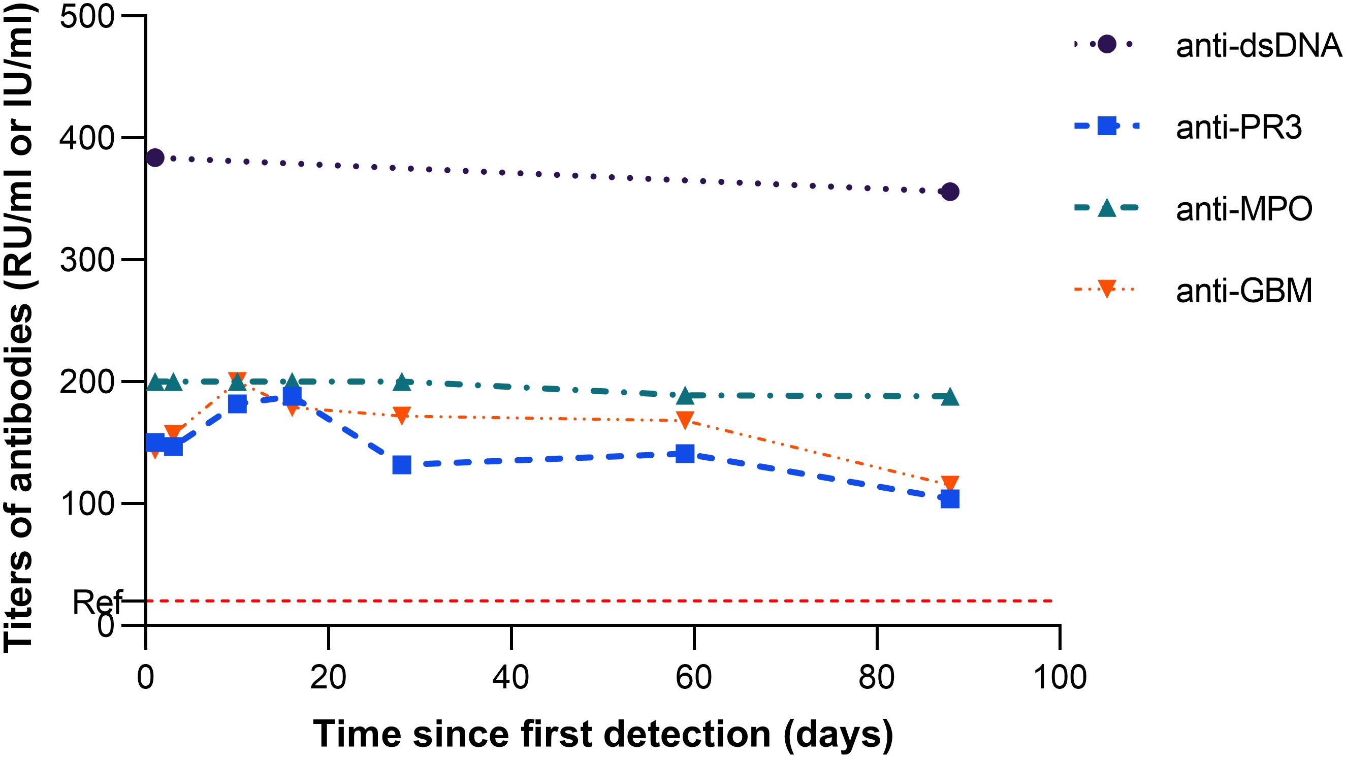 With respect to immunological abnormalities, he exhibited no signs of alopecia, rash, arthralgia, or otolaryngological and neurological involvement. Chest CT and bronchoscopy revealed no typical pulmonary signs of Goodpasture’s syndrome or vasculitis. Urine sediment microscopy showed no clinically significant dysmorphic erythrocytes. Kidney biopsy was advised but declined. In light of concurrent infection and multiple specific antibodies, especially anti-GBM, glucocorticoids (0.5 mg/kg/day) were prescribed. Over the three-month follow-up, no clinical signs of organ involvement were observed. Antibody titers for anti-GBM, PR3, MPO, and dsDNA remained persistently elevated (see Figure 3), and glucocorticoids were subsequently tapered and discontinued.