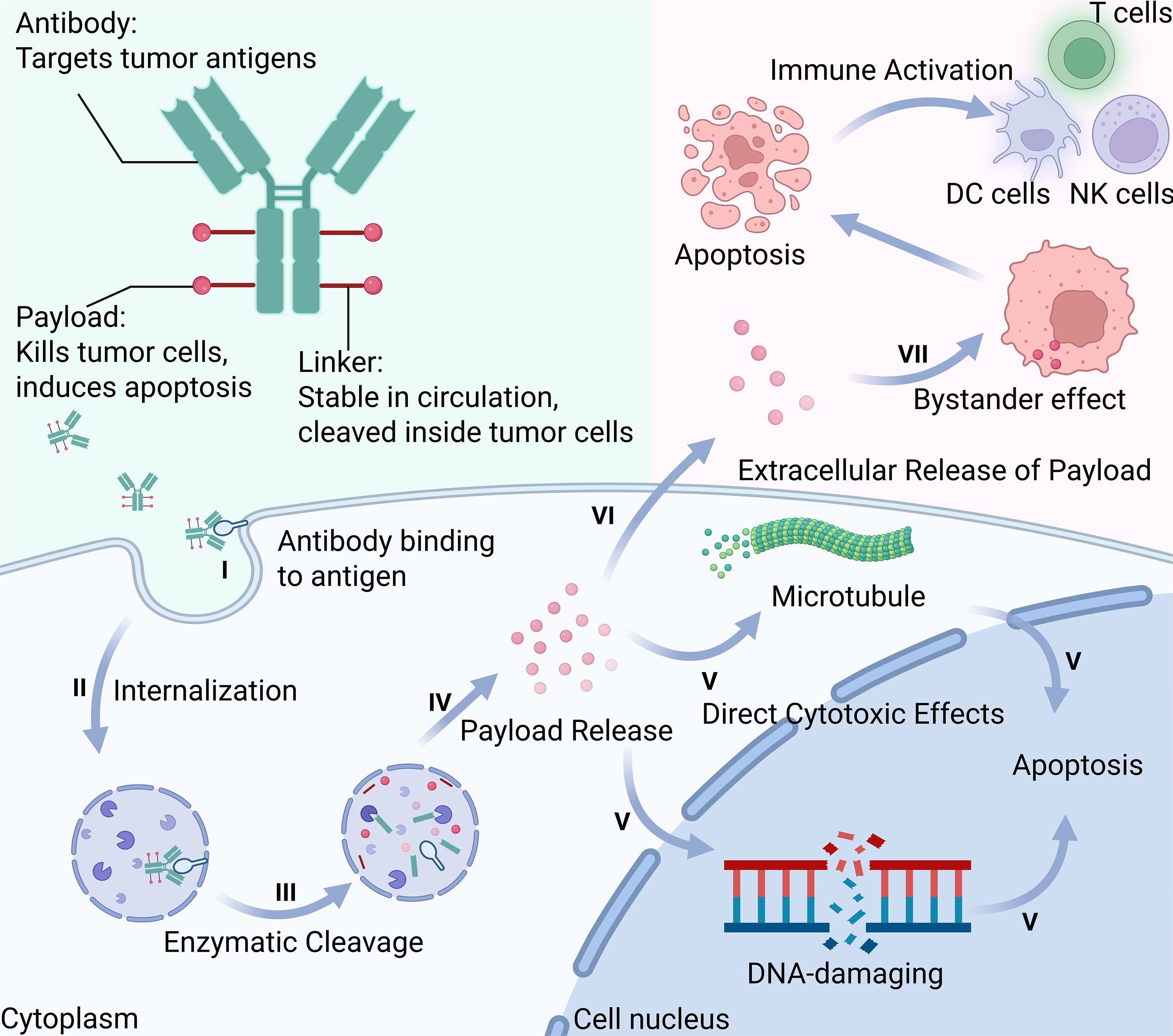 Figure 1. Schematic illustration of the seven-step mechanism of action of antibody-drug conjugates (ADCs): I. Antibody Binding to Antigen-The antibody specifically binds to tumor-associated surface antigens; II. Internalization-The ADC-antigen complex is internalized via receptor-mediated endocytosis; III. Enzymatic Cleavage-The linker is cleaved by intracellular enzymes within endosomes or lysosomes; IV. Payload Release-The cytotoxic payload is released into the cytoplasm or nucleus; V. Direct Cytotoxic Effects-The payload disrupts essential cellular functions by targeting DNA or microtubules; VI. Extracellular Release of Payload-A portion of the payload may exit the cell through lysis or active efflux; VII. Bystander Effect-The released payload kills neighboring tumor cells lacking target antigen. This figure was created using BioRender.com.