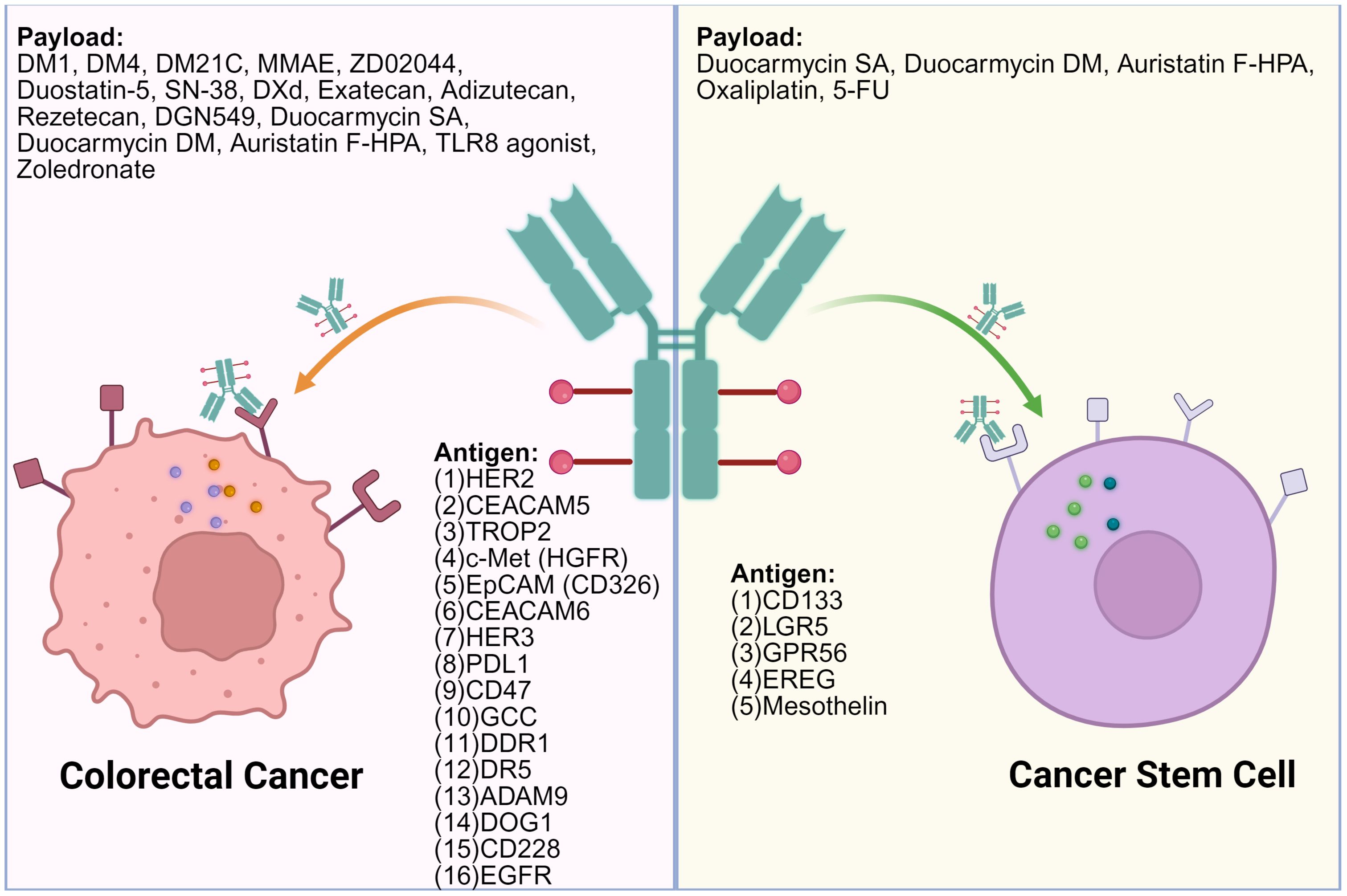 ADCs exert antitumor effects by targeting surface antigens and delivering cytotoxic agents. In CRC, these targets can be categorized into those expressed on tumor cell surfaces and those found on cancer stem-like cells (CSCs). Tumor cell-associated targets allow broad cytotoxic coverage, while stem cell-associated targets focus on eliminating therapy-resistant populations. The following sections summarize the major ADC targets in CRC and their corresponding drug candidates under development or clinical evaluation (Table 1). The distribution of targets and associated payloads across different cell types is illustrated in Figure 2.