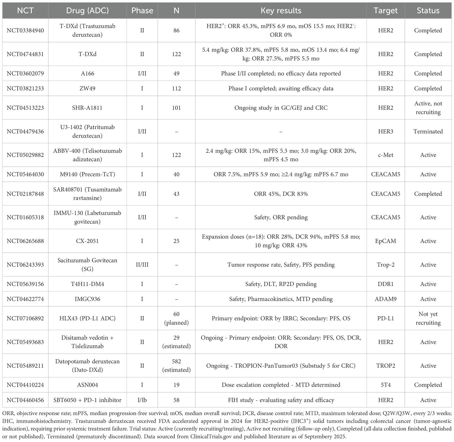 Clinical translation of ADCs in CRC remains nascent despite platform maturation. With ~15 approved ADCs across solid tumors, application in CRC lags behind breast and gastric cancers, primarily due to limited validated targets and desmoplastic barriers. Current clinical investigations focus on CEACAM5, HER2, and Trop-2, yet antigen heterogeneity and stromal density pose formidable obstacles.