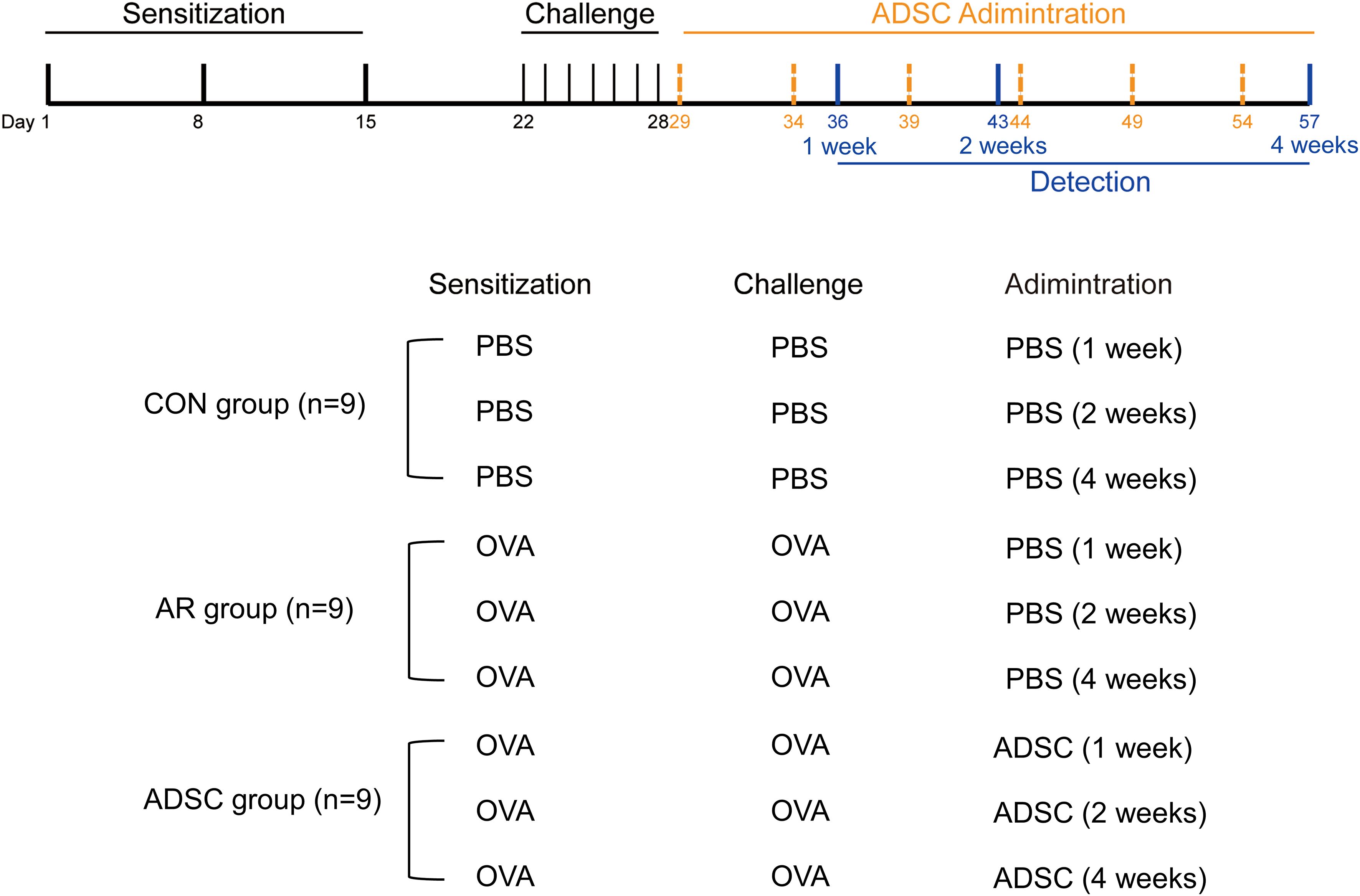 Figure 1. Experimental timeline. Sensitization was performed on days 1, 8, and 15 using intraperitoneal injections of OVA emulsified with aluminum hydroxide. Mice were challenged with intranasal instillation of OVA once daily on days 22–28. ADSCs were delivered via tail vein on days 29, 34, 39, 44, 49, and 54. All groups were terminated on day 36 (1 week), day 43 (2 weeks), or day 57 (4 weeks) for endpoint assessments. CON group (n = 9): PBS was used during sensitization, challenge, and administration. AR group (n = 9): OVA was used for sensitization and challenge, with PBS during the administration phase. ADSC group (n=9): OVA was used for sensitization and challenge; ADSCs were given during the administration phase. Each group was further divided into three subgroups, corresponding to 1-week, 2-week, and 4-week treatment durations, with 3 mice in each subgroup.