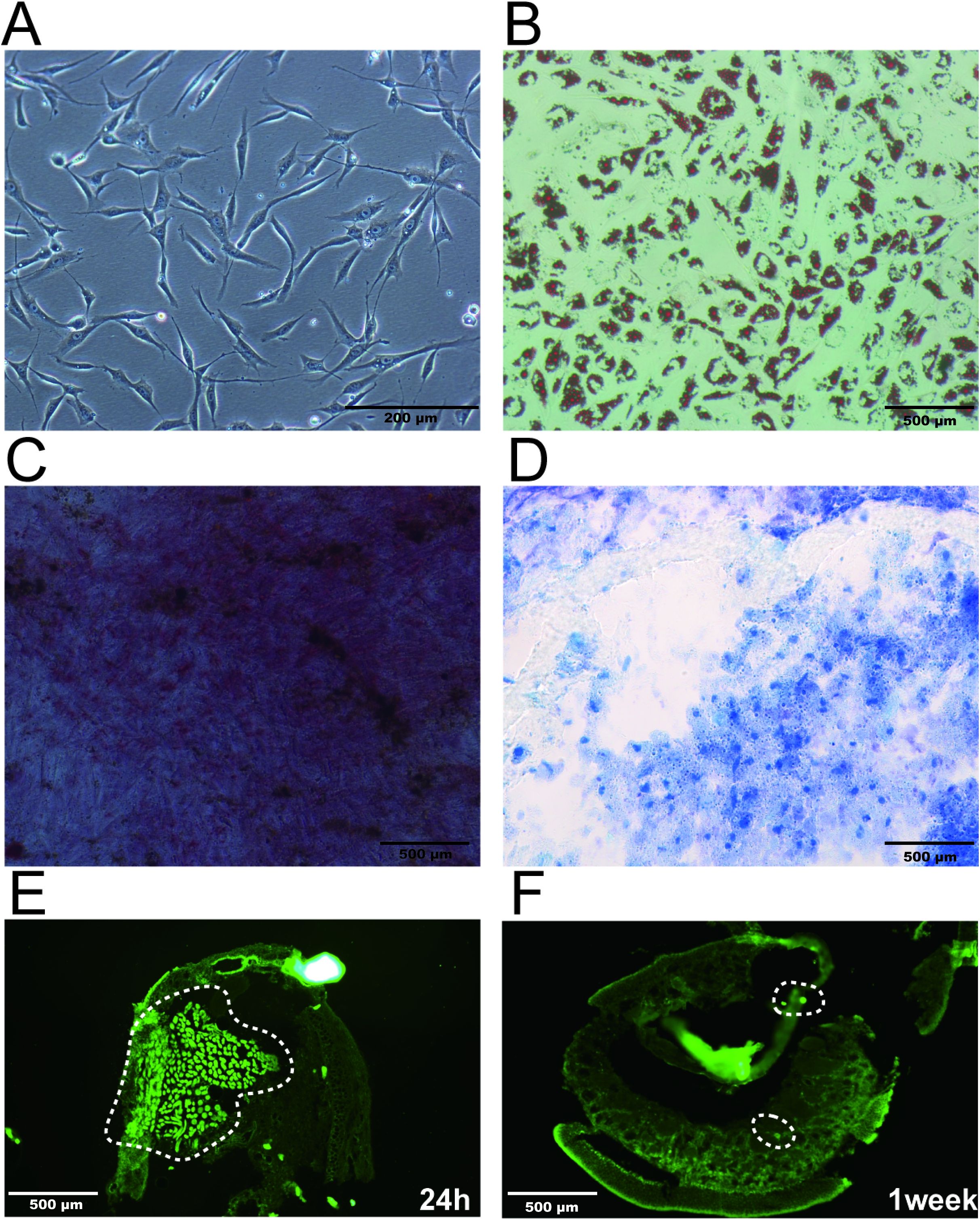 Figure 2. Characterization and nasal mucosal homing of ADSCs. (A) Representative morphology of ADSCs. (B–D) Multipotent differentiation of ADSCs: adipogenesis identified by Oil Red O staining (B); osteogenesis by Alizarin Red staining (C); chondrogenesis by Trypan Blue staining (D). (E) Nasal mucosa 24 hours after tail-vein injection of fluorescently labeled ADSCs. (F) Nasal mucosa 1 week after tail-vein injection of fluorescently labeled ADSCs.