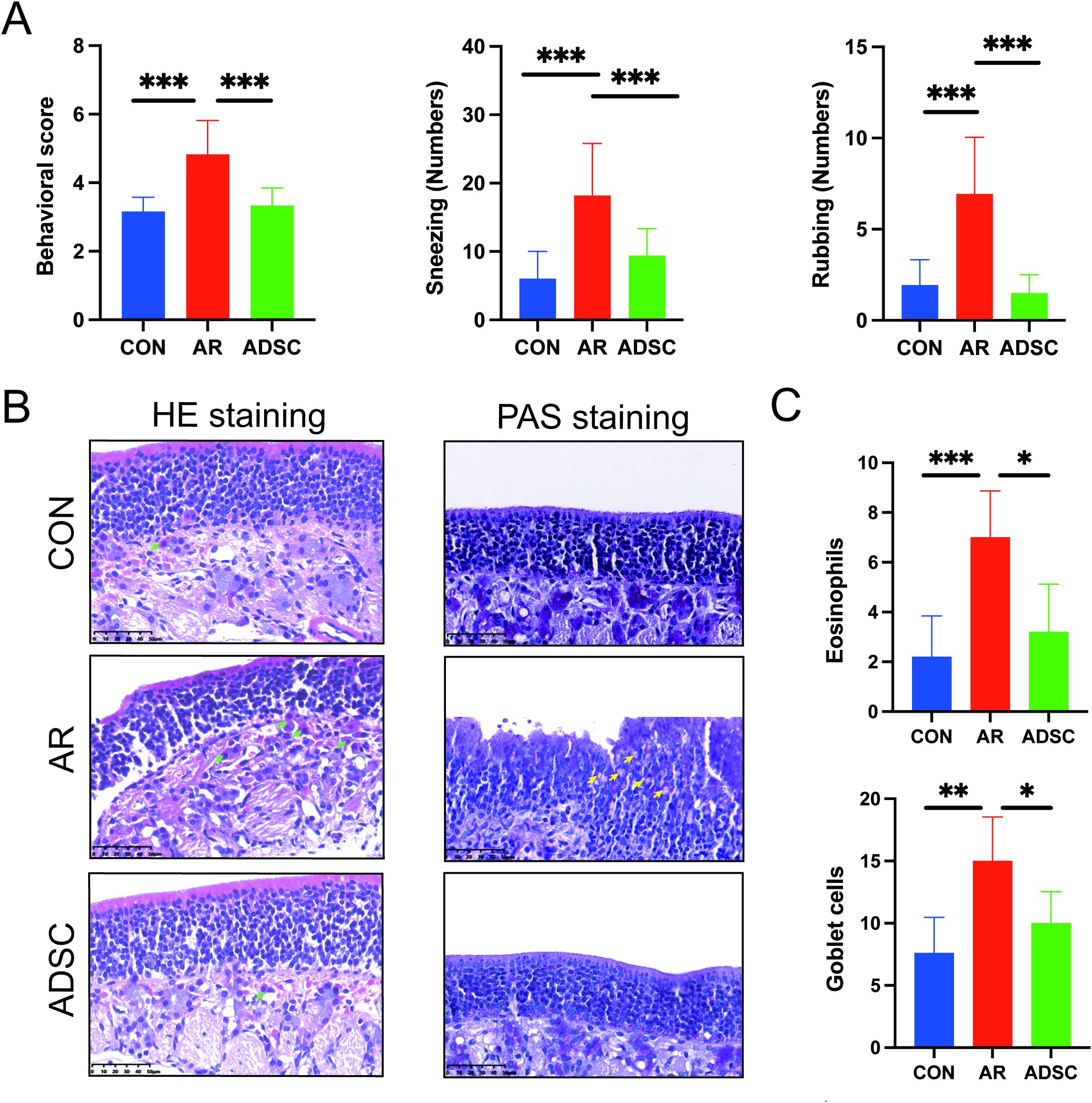 Figure 3. ADSC treatment attenuates allergic rhinitis symptoms and nasal mucosal pathology in OVA-induced AR mice. (A) Symptom scores, sneezing and nasal rubbing numbers (n = 6). (B) Representative histology of nasal mucosa: hematoxylin–eosin (H&E) and periodic acid–Schiff (PAS) staining (n = 9). Eosinophils are indicated by green arrows, and goblet cells are indicated by yellow arrows. (C) Quantification of eosinophils (from H&E; left panel in B) and goblet cells (from PAS; right panel in B) (n = 9). Data are shown as mean ± SD. *P < 0.05; **P < 0.01; ***P < 0.001.