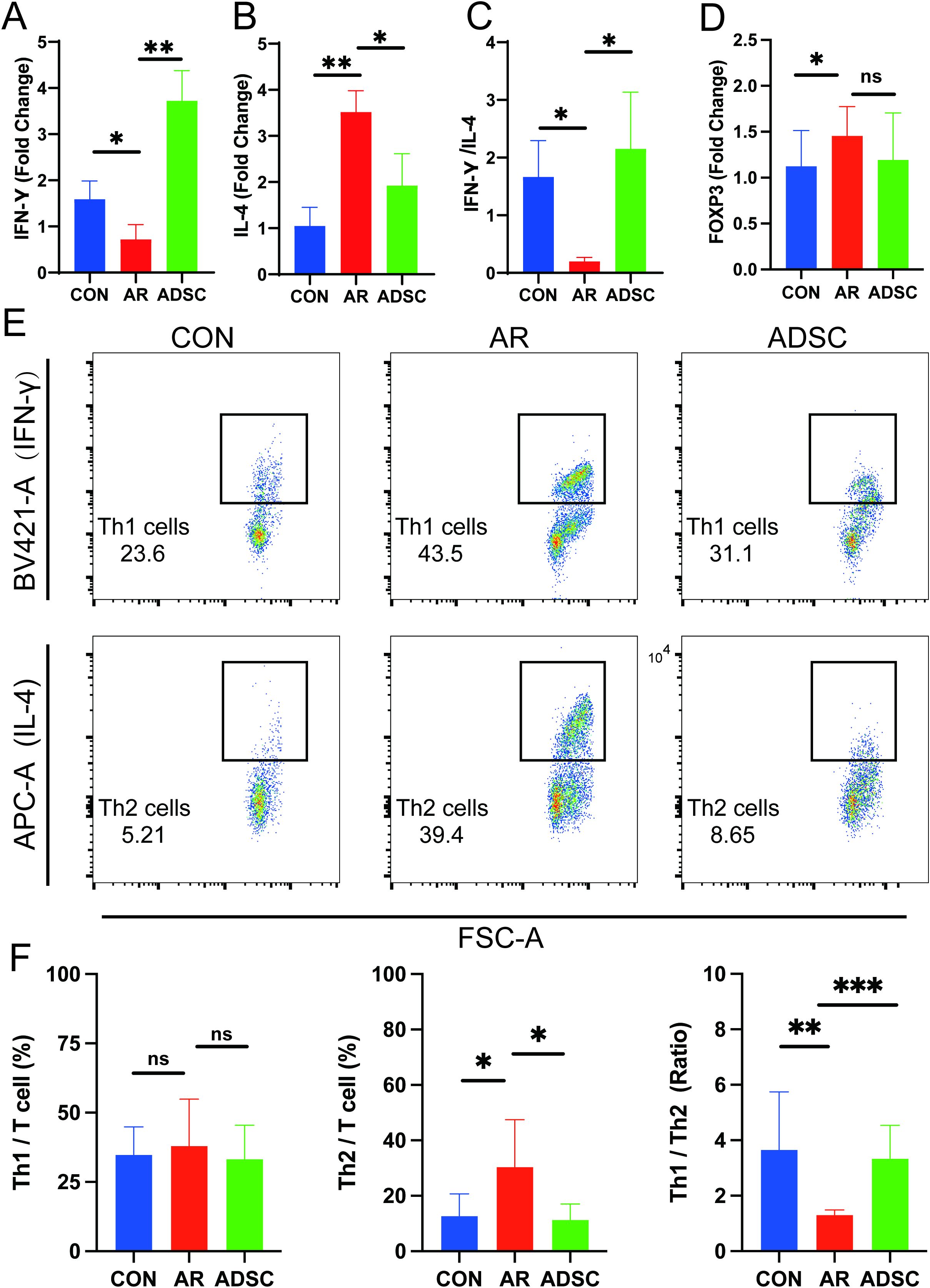 Figure 5. ADSC treatment rebalances systemic Th1/Th2 immunity in AR mice. (A–D) Splenic mRNA levels of IFN-γ (A), IL-4 (B), IFN-γ/IL-4 ratio (C) and FOXP3 (D) measured by qRT-PCR (n = 9). (E) Flow cytometry analysis of splenic Th1 and Th2 subsets (n=9). (F) Quantification of splenic Th1 and Th2 cells and the Th1/Th2 ratio derived from (E). Data are expressed as mean ± SD. *P < 0.05; **P < 0.01; ***P < 0.001.
