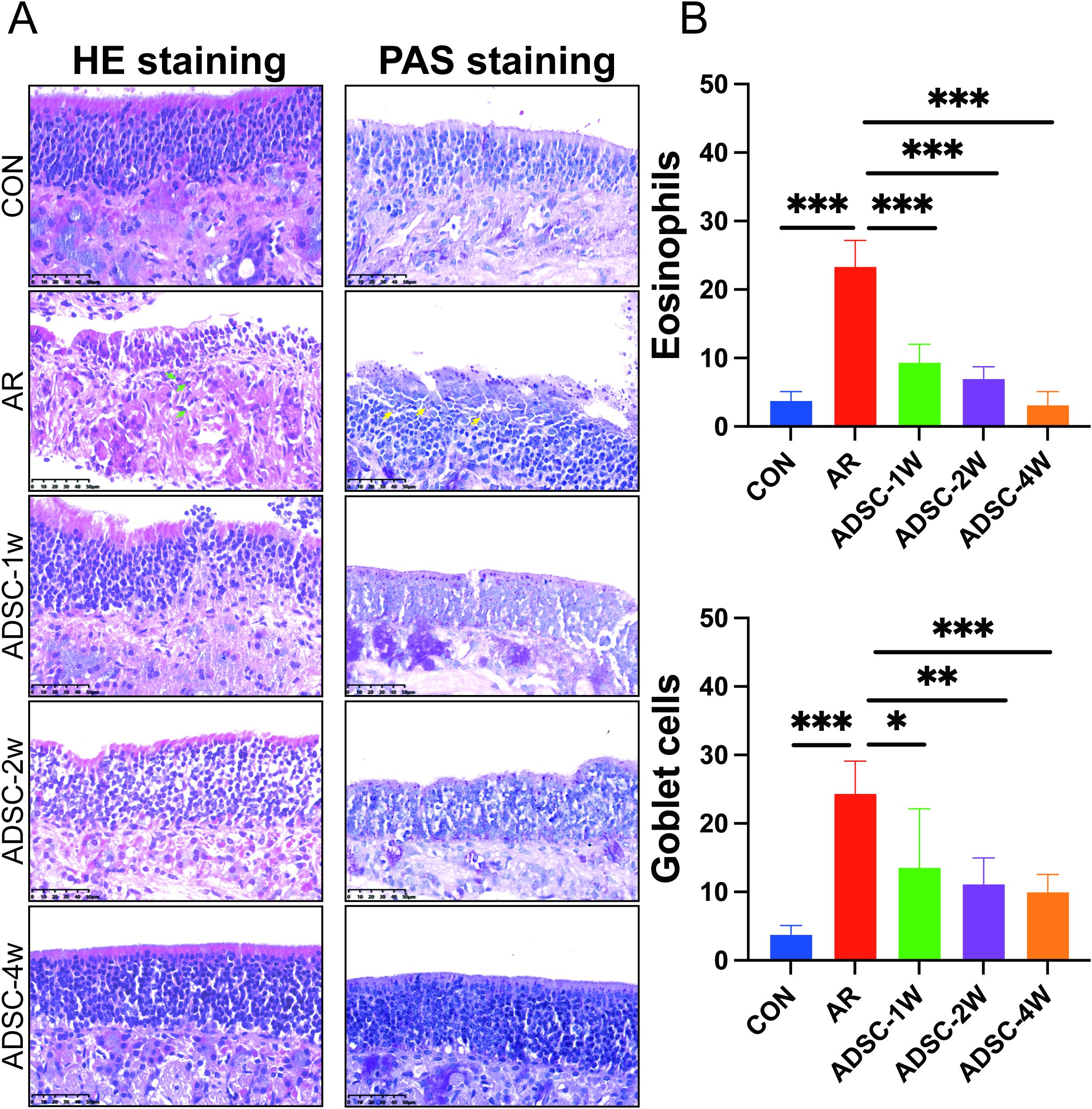 Figure 6. ADSC treatment attenuates nasal mucosal pathology across treatment durations. (A) Representative histology of nasal mucosa: hematoxylin–eosin (H&E) and periodic acid–Schiff (PAS) staining (n=9). Eosinophils are indicated by green arrows, and goblet cells are indicated by yellow arrows. (B) Quantification of eosinophils (from H&E; left panel in B) and goblet cells (from PAS; right panel in B) (n=9). Data are shown as mean ± SD. *P < 0.05; **P < 0.01; ***P < 0.001..