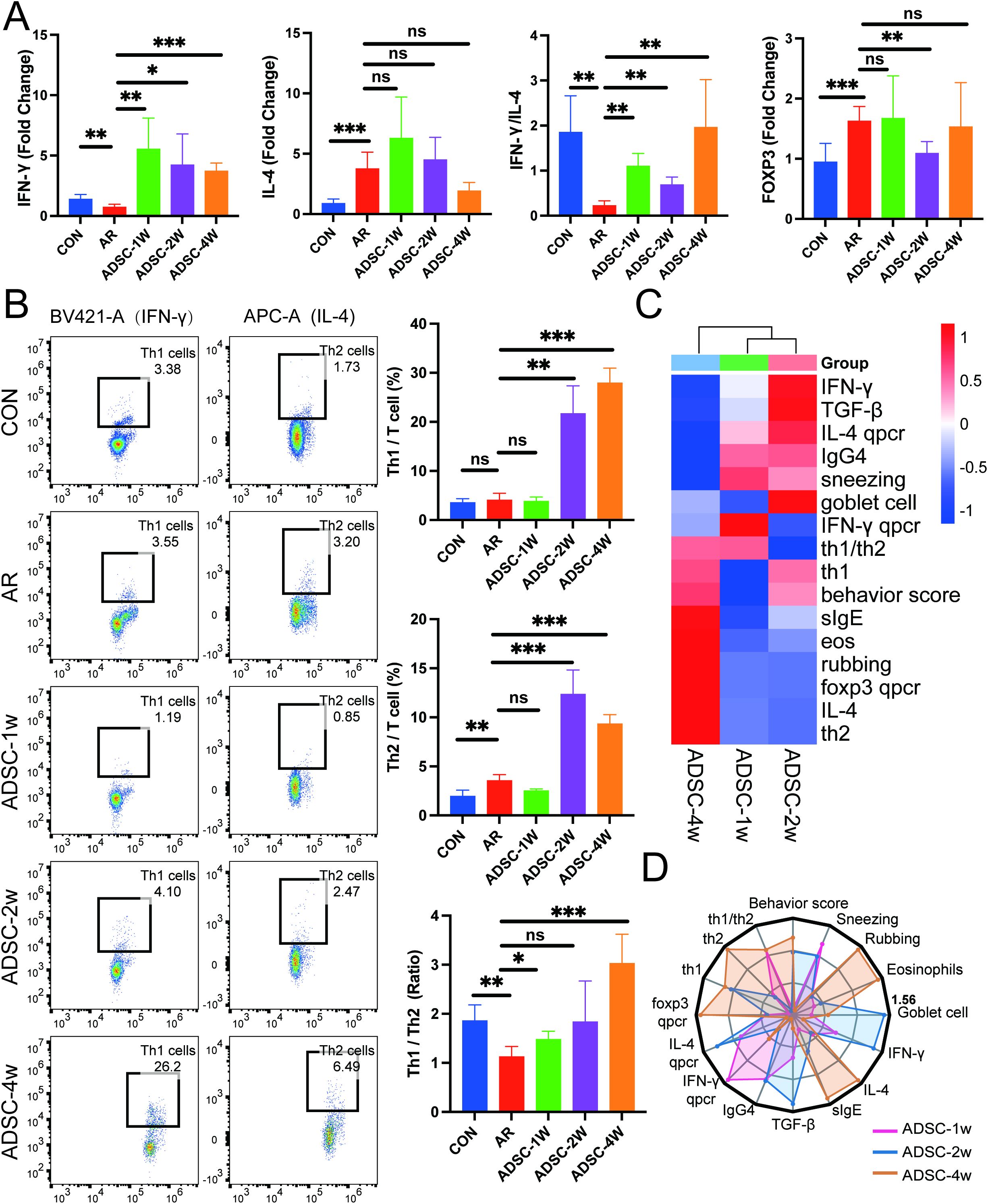 Figure 7. Four-week ADSC treatment achieves optimal Th1/Th2 balance and integrated therapeutic efficacy. (A) Splenic mRNA levels of IFN-γ, IL-4, IFN-γ/IL-4 ratio and FOXP3 measured by qRT-PCR (n = 9). (B) Flow cytometry analysis and quantification of splenic Th1 and Th2 subsets and the Th1/Th2 ratio (n=9). (C) Heatmap of TEI comparison across the three administration strategies. (D) Radar chart of TEI comparison across the three administration strategies. Data are expressed as mean ± SD. *P < 0.05; **P < 0.01; ***P < 0.001.