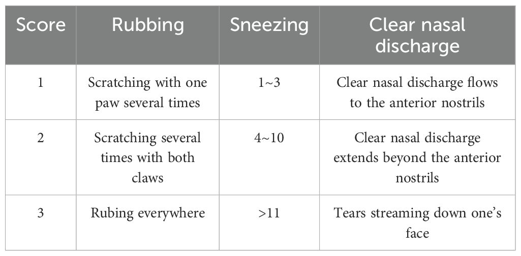 Mice were euthanized at three time points, namely 1, 2, and 4 weeks after administration. Before each euthanasia, nasal symptoms were observed and recorded for 15 minutes following stimulation with the same allergen solution. Symptom severity was evaluated according to the established scoring criteria showed in Table 1.