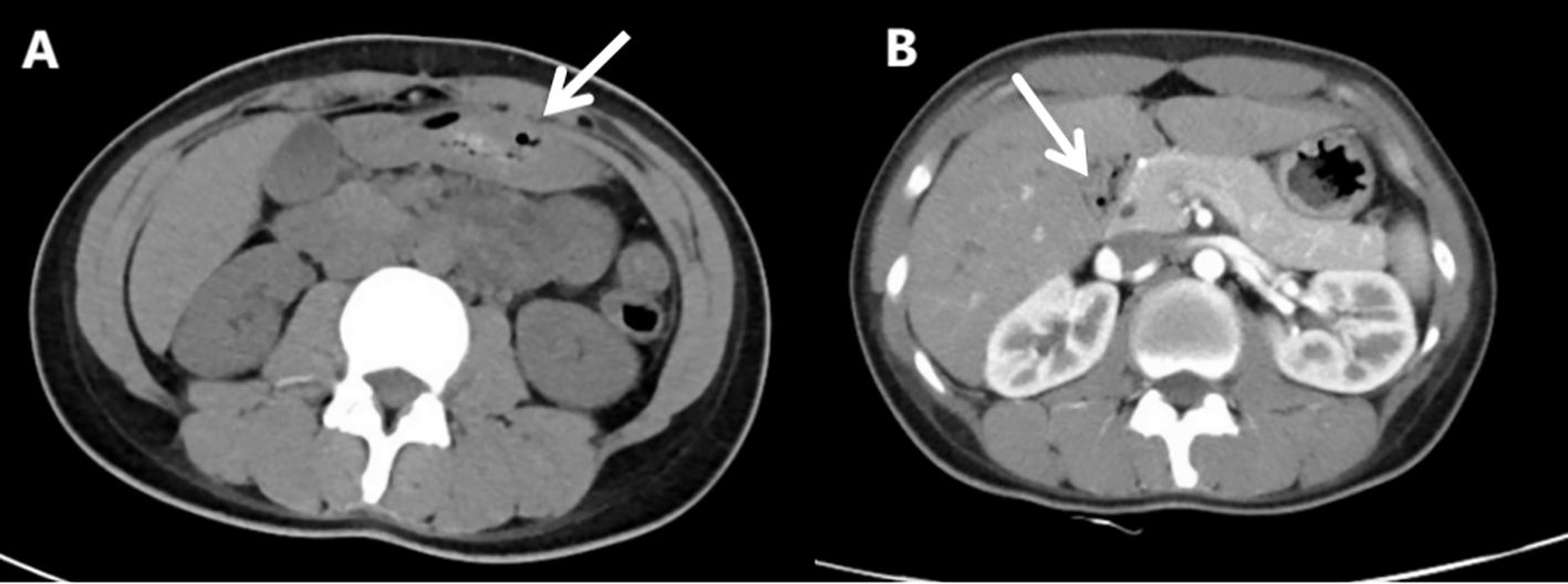 CT scans labeled A and B show axial abdominal views. Panel A indicates abnormal findings with an arrow pointing to a darkened area in the upper abdomen. Panel B features an arrow highlighting a similar area near the center, suggesting further abnormality.
