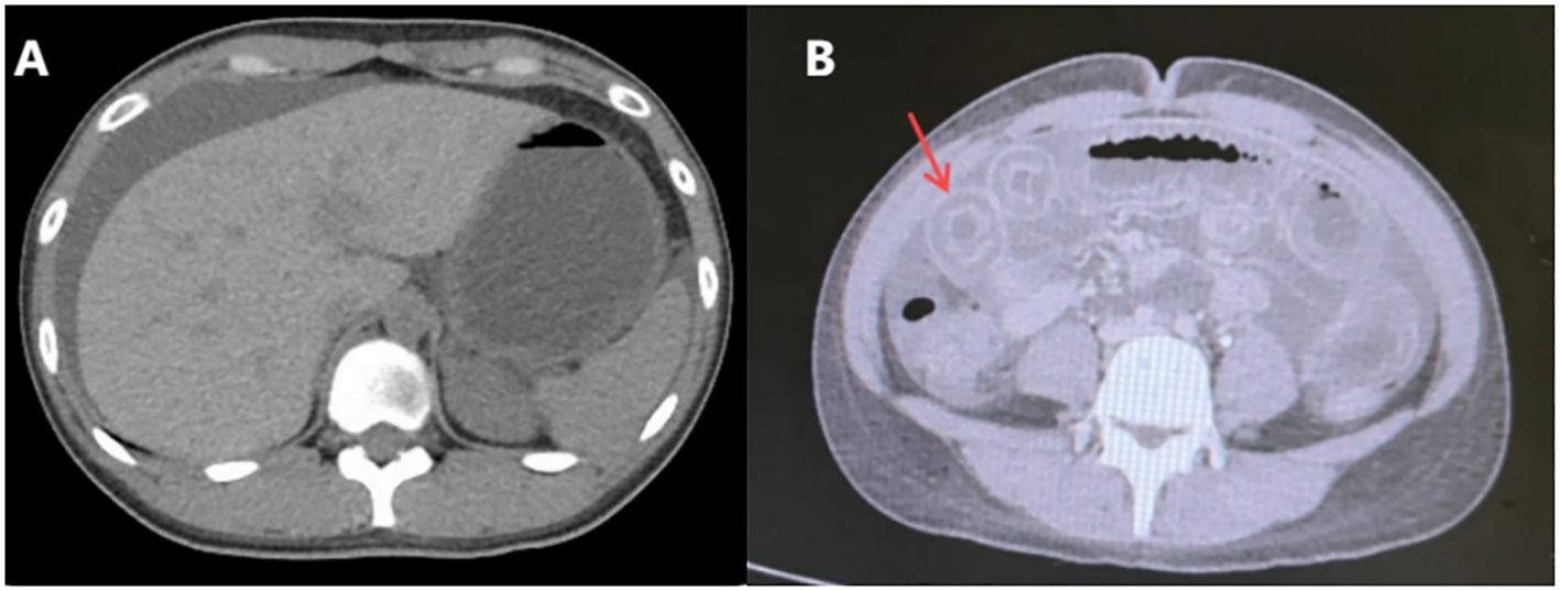 Figure 2. Re-examination of abdominal computed tomography scan(Aug 31st, 2024). (A) Moderate ascites. (B) Widespread edema and thickening of the intestinal wall in the horizontal segment of the duodenum, the entire segment of the jejunum, and the proximal segment of the ileum (target ring sign).