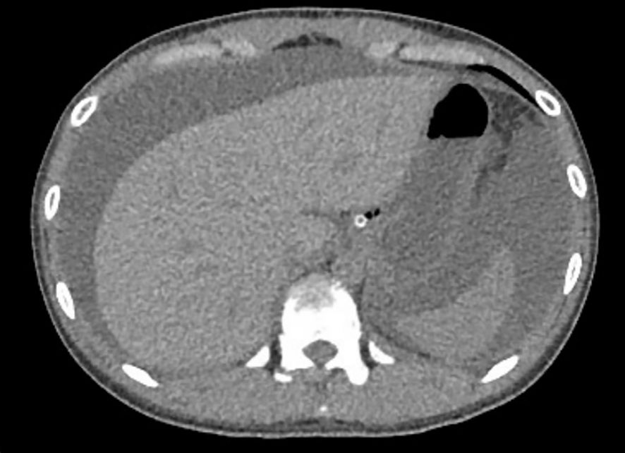 Figure 3. Re-examination of abdominal computed tomography scan (Sept 1st, 2024). A large amount of ascites, which has increased compared to before. Widespread thickening and edema of the abdominal intestinal wall.