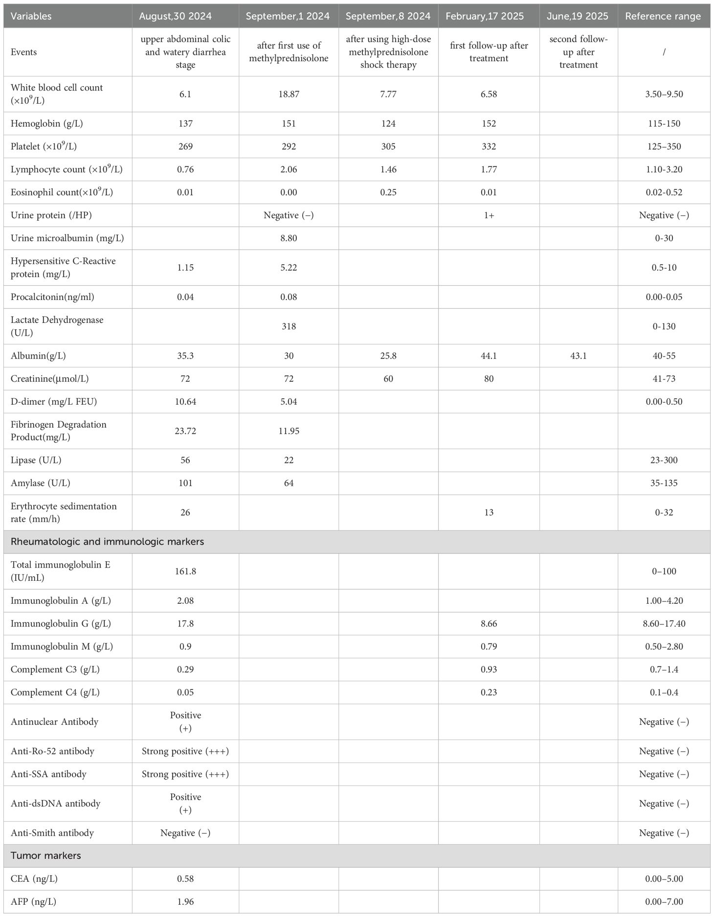 Three days later, abdominal pain improved significantly. Over the next week, methylprednisolone was tapered from 120 mg/day to 80 mg/day, in combination with intravenous cyclophosphamide (0.4g as a single pulse). To clarify the sequence of clinical events and laboratory changes, a timeline of key parameters across critical follow-up time points was provided (Table 1).