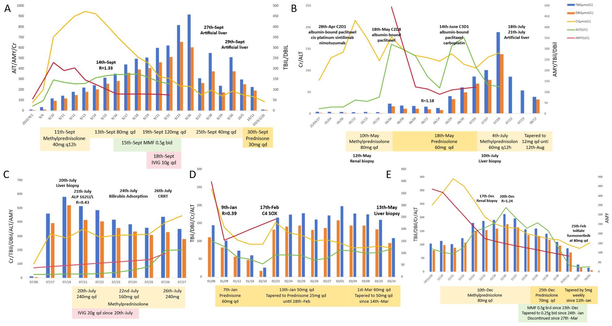 A 65-year-old male with a medical history of well-controlled type 2 diabetes diagnosed with stage IVA lung cancer (cT4N2M1a) in October 2024. He received pemetrexed and cisplatin regimen on October 24th. Next-generation sequencing (NGS) identified an epidermal growth factor receptor (EGFR) exon 20 insertion (EX20ins). Tislelizumab 200 mg was added in the 2nd cycle treatment on Nov 23rd, 2024. Two weeks after the first dose of tislelizumab, he developed anorexia and oliguria (urine volume 500 ml/day). Laboratory investigations demonstrated elevated levels of ALT (84 U/L), TBil (103.5 μmol/L), DBil (79.5 μmol/L), ALP (448 U/L), Cr (246 μmol/L; baseline 78 μmol/L), AMY (435 U/L), and LIP (85 U/L). R value was 1.24. Renal biopsy performed on demonstrated interstitial nephritis with dense lymphocytic infiltration. The diagnosis of ICIs-related hepatitis (G3), nephritis (G3), and asymptomatic pancreatic enzyme elevation (G2) was established. Intravenous methylprednisolone 80 mg daily (1.6 mg/kg/day prednisone-equivalent) was initiated on Dec 16th, 2024. Due to unsatisfied response of bilirubin to corticosteroids, MMF 0.5g twice daily was added since Dec 23rd and the level of bilirubin began to significantly decline since Dec 26th. The steroid was tapered to predsolone 70 mg daily on Dec 25th, followed by weekly reductions of 5 mg since January 11th, 2025. The MMF was tapered to 0.25g twice daily on Jan 24th and discontinued since Mar 27th. The patient reported improvement in anorexia and oliguria. After recovery, he restarted treatment with furmonertinib (a EGFR tyrosine kinase inhibitor) 80 mg daily (Feb 25th, 2025), escalated to 120 mg daily on Mar 1st. No significant adverse effects were observed after the treatment of steroid and MMF. Serial imaging assessments (Apr and June, 2025) demonstrated stable disease. The timeline and comprehensive treatment are provided in Figure 1E; Supplementary Figure 1E.