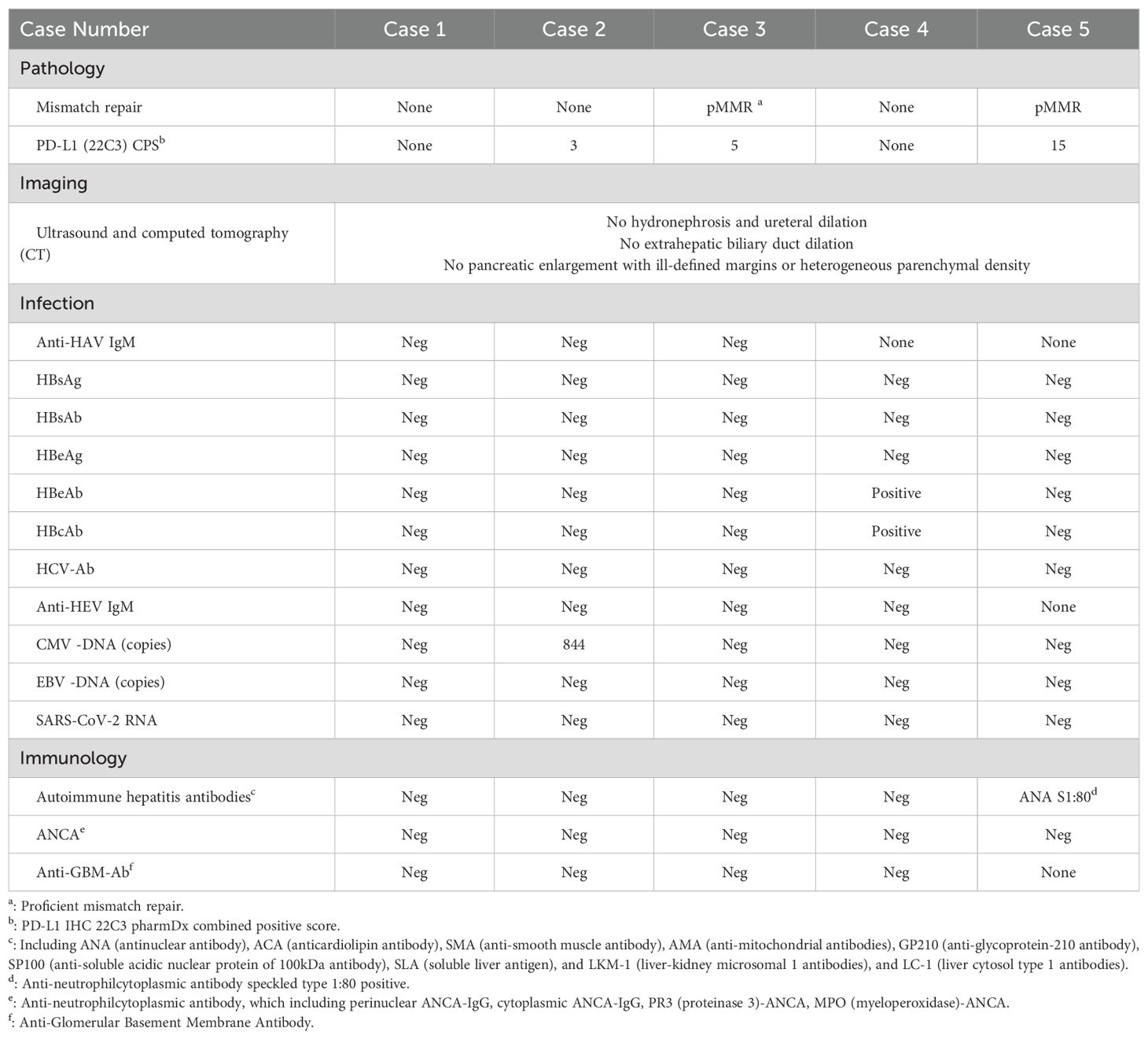 With the expanding application of immune checkpoint inhibitors (ICIs), irAEs have become a major concern, demonstrating unpredictable onset patterns and effected organs (4). The incidence of irAEs reported in different studies ranges from 15.34% to 85.23%, most frequently affected sites were cutaneous (27.0%-56.1%), endocrine (0.8%-30.4%), and gastrointestinal (0%-33.8%) system (5, 6). Incidence of ICI-induced hepatitis was reported to be 0.7% to 2.1% in PD-1, and much higher in CTLA-4 population (up to 12-16%), notably, fulminant hepatic failure was relatively rare (0.1%‐0.2%) (7). Acute renal injury (AKI), and pancreatis occured with an incidence of approximately 2-3% and 0.3-3.9% (8–11), respectively. The severe ICI-related AKI (defined as serum creatinine elevation > 3×baseline, or SCr >4.0 mg/dL, or requiring renal replacement therapy) was 0.6% (12). Multi-organ irAEs are relatively uncommon (5-9%), pneumonitis and thyroiditis emerged as the most frequently observed combination (13). This case series represents the first documented description of a distinct multi-organ irAE syndrome characterized by synchronous involvement of hepatic, renal, and pancreatic system, with an incidence rate of 0.40% (5/1239) in the Department of Medical Oncology at Peking Union Medical College Hospital. The mechanism of multisystem irAEs was still unknown, it may be attributed to shared pathobiological features, such as specific human leukocyte antigen (HLA) profiles or autoantibody generation (14, 15).