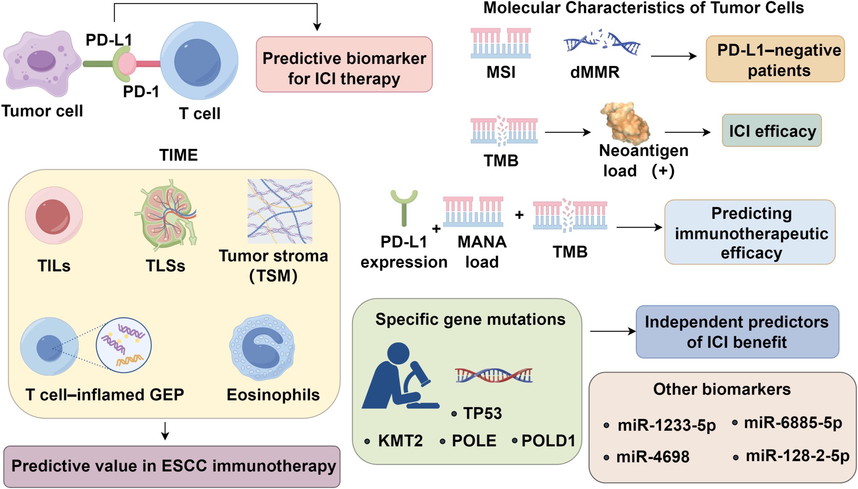 Programmed death-ligand 1 (PD-L1) expression remains the most widely recognized biomarker for predicting response to ICIs. Nevertheless, its predictive accuracy is limited, and a substantial proportion of patients with high PD-L1 expression still fail to respond to treatment (5). Ongoing research efforts have identified two broad categories of emerging biomarkers with potential predictive value in immunotherapy. The first category encompasses features of the TIME, such as tumor-infiltrating lymphocytes (TILs), the presence of tertiary lymphoid structures (TLS), and T cell–inflamed gene expression profiles. These factors reflect the immune contexture within the tumor and its potential responsiveness to immune modulation (6). The second category involves molecular characteristics intrinsic to tumor cells, including high microsatellite instability (MSI-H)/deficient mismatch repair (dMMR), tumor mutational burden (TMB), and neoantigen load, all of which are associated with enhanced immunogenicity and increased likelihood of immune recognition (7). Additional exploratory biomarkers include serum non-coding RNAs, DNA methylation signatures, and components of the gut microbiome, though their predictive relevance in ESCC remains to be validated through larger, high-quality datasets (8, 9). This review aims to provide a comprehensive synthesis of the current understanding of immunotherapeutic biomarkers in ESCC, with particular emphasis on PD-L1, the TIME, tumor cell–related molecular features, and their clinical implications in guiding immunotherapy strategies.