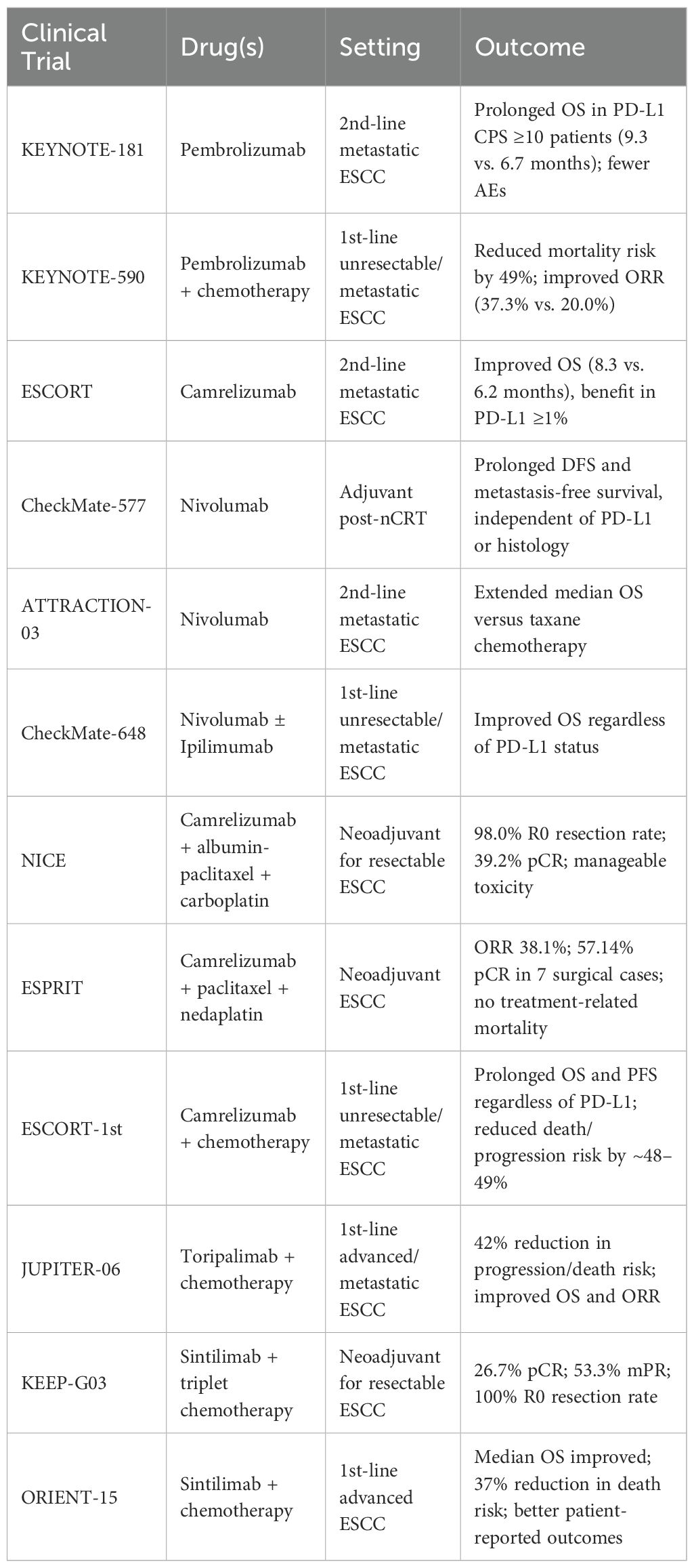 Perioperative toripalimab combined with neoadjuvant chemoradiotherapy (nCRT) was evaluated in 20 patients with locally advanced ESCC (74). Among them, 13 underwent surgery, yielding a pathological complete response (pCR) rate of 54%. Lymphopenia and leukopenia were the most common adverse events (AEs), with no postoperative recurrences observed at a 6-month median follow-up. These findings support the feasibility and tolerability of toripalimab–nCRT regimens in resectable ESCC, though long-term efficacy warrants further validation. In metastatic ESCC, toripalimab monotherapy showed preliminary activity, and the phase III JUPITER-06 trial (75) demonstrated that toripalimab plus chemotherapy significantly improved median OS and ORR by 17.2%, reducing the risk of progression or death by 42% versus chemotherapy alone. Similarly, the KEEP-G03 study (76) assessed neoadjuvant sintilimab with triplet chemotherapy (liposomal paclitaxel, cisplatin, and S-1) in resectable ESCC. Among 15 surgical patients, all achieved R0 resection; pCR and major pathological response (mPR) rates were 26.7% and 53.3%, respectively. Grade 3–4 AEs included leukopenia, neutropenia, and anemia, with no grade 5 events or surgery delays. In the ORIENT-15 phase III trial (77), sintilimab plus chemotherapy significantly prolonged median OS and PFS in advanced ESCC, reducing death and progression risks by 37% and 44%, respectively, with a manageable safety profile. Patient-reported quality-of-life outcomes also favored the sintilimab combination arm, underscoring its clinical benefit.