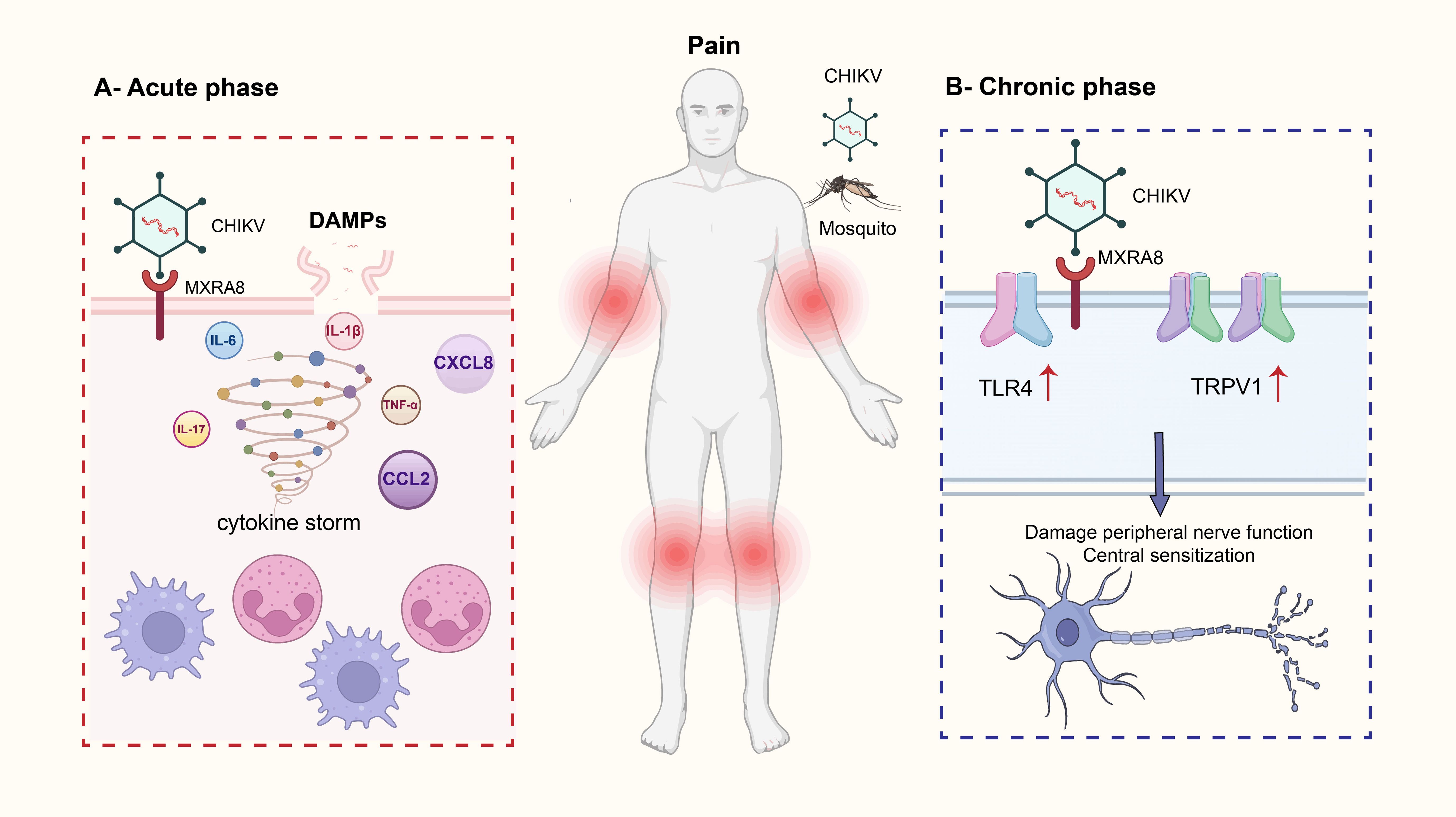 Chikungunya is a mosquito-borne viral disease that causes acute and chronic pain symptoms, particularly polyarthralgia and myalgia. The pathogenesis begins with the infection of specific cells, which triggers an inflammatory response that underlies the clinical symptoms during the acute phase. In the acute phase, patients typically experience intense inflammatory arthralgia and myalgia, often accompanied by fever and joint swelling (43, 44). The pain develops rapidly and can be severe, significantly impairing mobility and daily functioning. As the disease progresses, some individuals develop persistent arthralgia and neuropathic pain, which are more difficult to treat and can substantially affect quality of life. These prolonged symptoms pose a major management challenge, partly because they often overlap with other arboviral infections such as dengue and Zika virus (45).