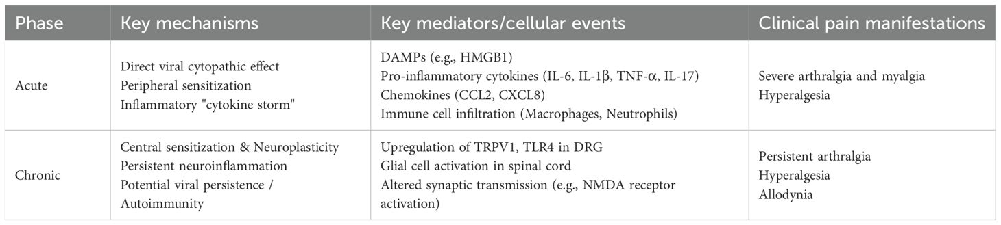 The mechanisms underlying pain in CHIKF involve a complex interplay of direct tissue damage, immune responses, and neural sensitization (19, 20). The virus induces cytopathic effects in synovial cells, muscle fibers, and endothelial cells, leading to cell injury and death (17, 21). This damage results in the release of damage-associated molecular patterns (DAMPs), which activate immune cells and nociceptive neurons, thereby amplifying pain signaling (22–24). In affected joints, the disruption of normal synovial homeostasis leads to synovitis and cartilage degradation, which are key contributors to joint pain (25). During the acute phase of infection, a robust immune response is triggered, characterized by the release of pro-inflammatory cytokines such as interleukin-6 (IL-6), tumor necrosis factor-alpha (TNF-α), and interleukin-1β (IL-1β) (26). It has also been demonstrated that IL-17 plays as a putative hallmark of intense arthralgia and age-related serum immune mediator networks during acute CHIKF (27). These cytokines, along with DAMPs, provoke an “immune storm” that floods infected tissues with inflammatory mediators (28–30). These substances sensitize and activate nociceptors, the pain-sensing nerve endings, resulting in heightened pain perception (Table 1).