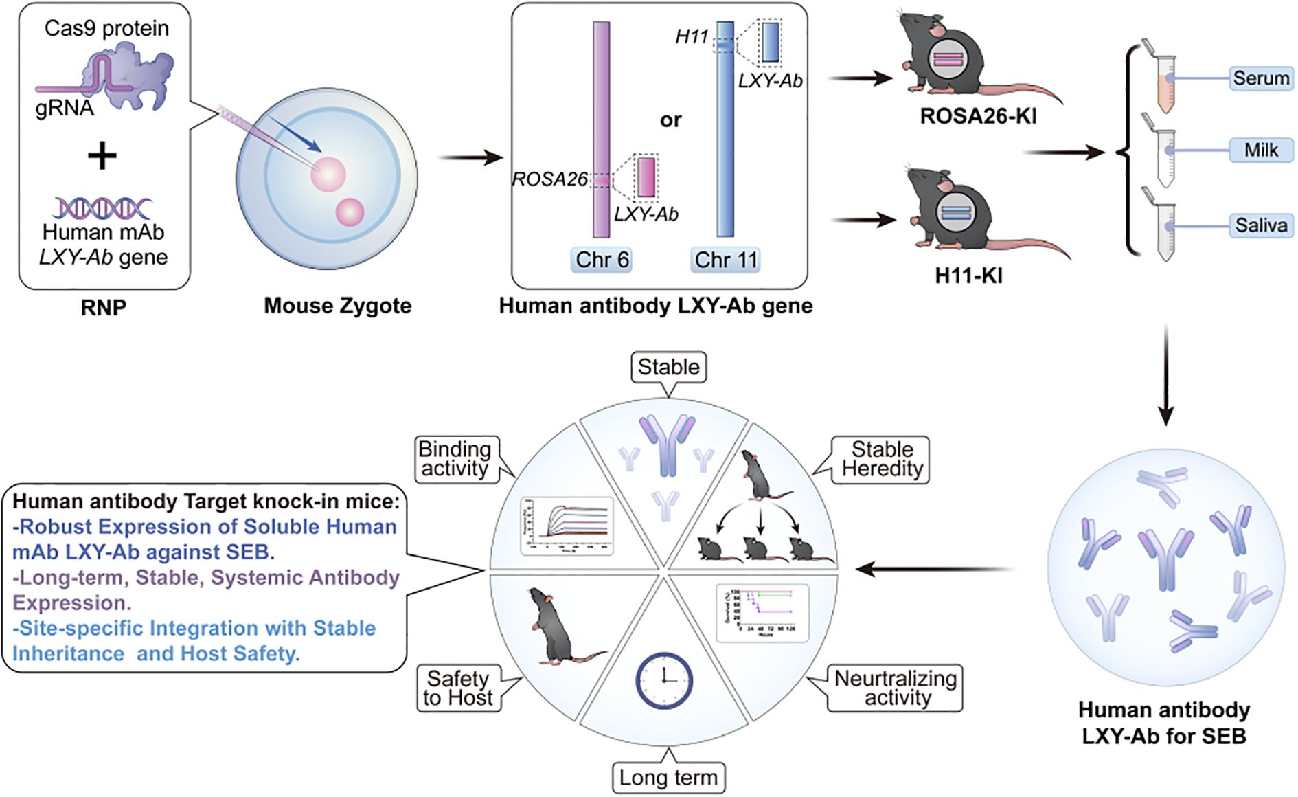 Figure 1. Locus-specific CRISPR/Cas9 integration enables stable and heritable production of human anti-SEB antibodies with preserved functionality in GE mice. This schematic depicts a genome-editing platform enabling independent integration of the human anti-staphylococcal enterotoxin B (SEB) monoclonal antibody LXY-Ab into two distinct genomic safe harbor loci: ROSA26 (Chr6) or H11 (Chr11). The strategy achieves site-specific, heritable insertion at either locus, ensuring robust and stable expression of fully glycosylated LXY-Ab across serum, milk and saliva. It maintains specific N-glycosylation patterns that preserve high SEB-binding affinity and in vivo neutralization efficacy. By facilitating comparative evaluation of ROSA26- and H11-targeted models, this platform combines locus-dependent expression stability with glycoform precision, advancing scalable in vivo production of therapeutic antibodies and serving as a robust tool for antitoxin development and functional validation.
