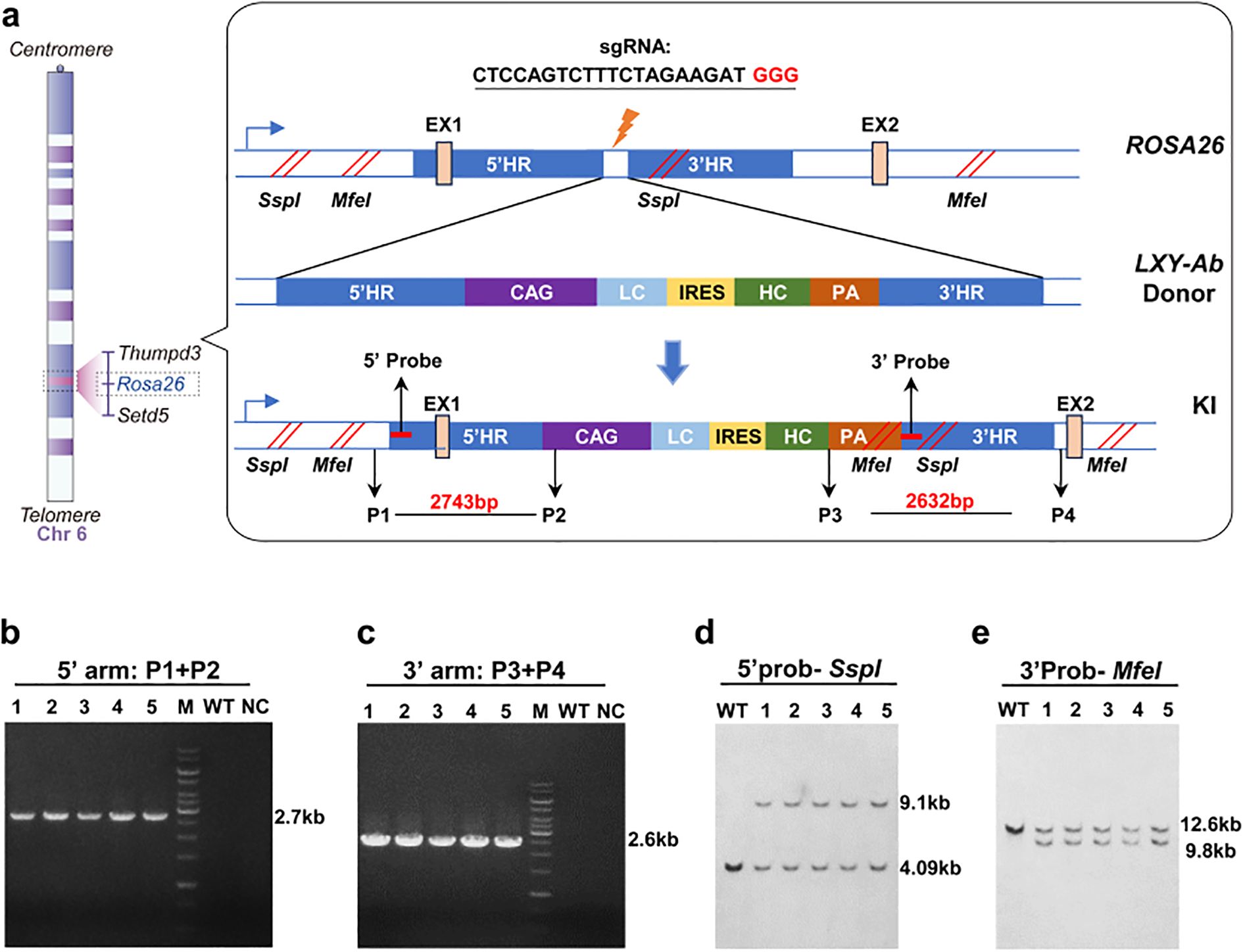 Figure 2. CRISPR/Cas9-mediated integration of human LXY-Ab at the ROSA26 locus. (a) Schematic of the knock-in strategy targeting the first intron of the ROSA26 locus (Chr6: 113,043,498–113,054,144). The donor vector contains 5′ and 3′ homology arms (5′HR: 2,115 bp; 3′HR: 2,153 bp), a CAG promoter-driven bicistronic cassette (light chain [LC] + IRES + heavy chain [HC]), a polyadenylation signal (PA), and restriction sites (SspI, MfeI) for Southern blot validation. (b, c) PCR genotyping of F1 GE mice using primers flanking the integration junctions, yielding 2.7 kb (5′) and 2.6 kb (3′) amplicons. Wild-type (WT) and no-template controls (NC) confirm specificity, with DNA ladder (15 kb marker, M) as reference. (d, e) Southern blot analysis of genomic DNA digested with restriction enzymes, hybridized with locus-specific probes. WT alleles display bands at 9.1 kb (SspI) and 12.6 kb (MfeI), while knock-in (KI) alleles yield 4.09 kb (SspI) and 9.8 kb (MfeI), confirming precise integration. Primer and probe sequences are detailed in Supplementary Table S1.