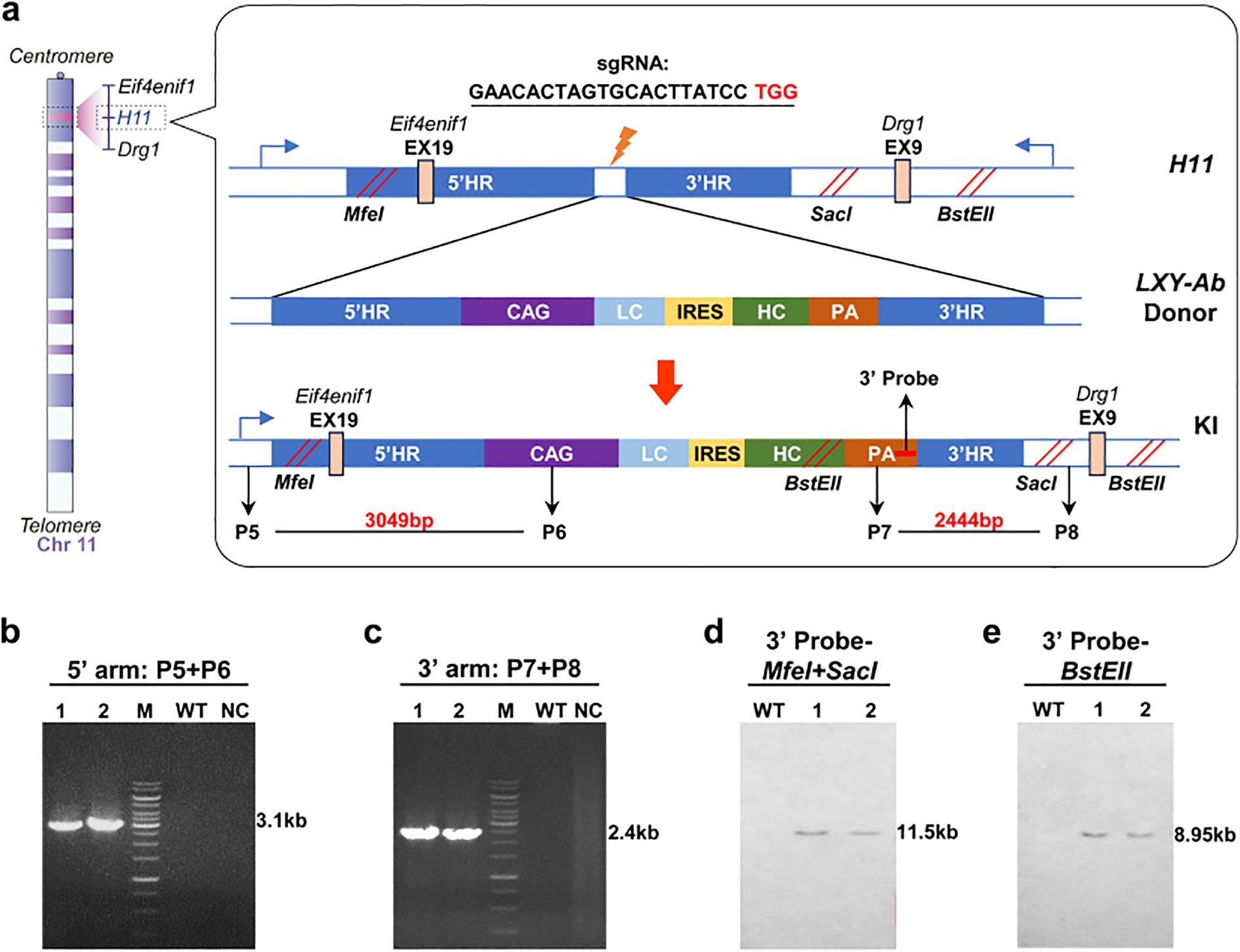 Figure 3. Construction and identifition of GE mice in H11 locus. (a) Schematic of the H11 locus (Chr11:94,129,124-94,138,327) knock-in strategy, targeting its first intron with a donor vector designed with 5′ and 3′ homology arms (2,104 bp and 2,038 bp, respectively), a CAG promoter-driven LC-IRES-HC bicistronic cassette, and a PA. Restriction sites (MfeI/SacI, BstEII) enable Southern blot validation. (b, c) PCR genotyping of F1 mice using locus-specific primers generates 3.1 kb (5′ junction) and 2.4 kb (3′ junction) amplicons, WT and no-template controls (NC) confirming specificity (15 kb DNA ladder, M). (d, e) Southern blot analysis using locus-specific probes distinguishes WT alleles (12.3 kb and 9.6 kb) from knock-in (KI) alleles (7.2 kb and 5.8 kb) following restriction enzyme digestion (MfeI/SacI for 5′ probe; BstEII for 3′ probe), validating precise integration. Primer/probe details are provided in Supplementary Table S1.
