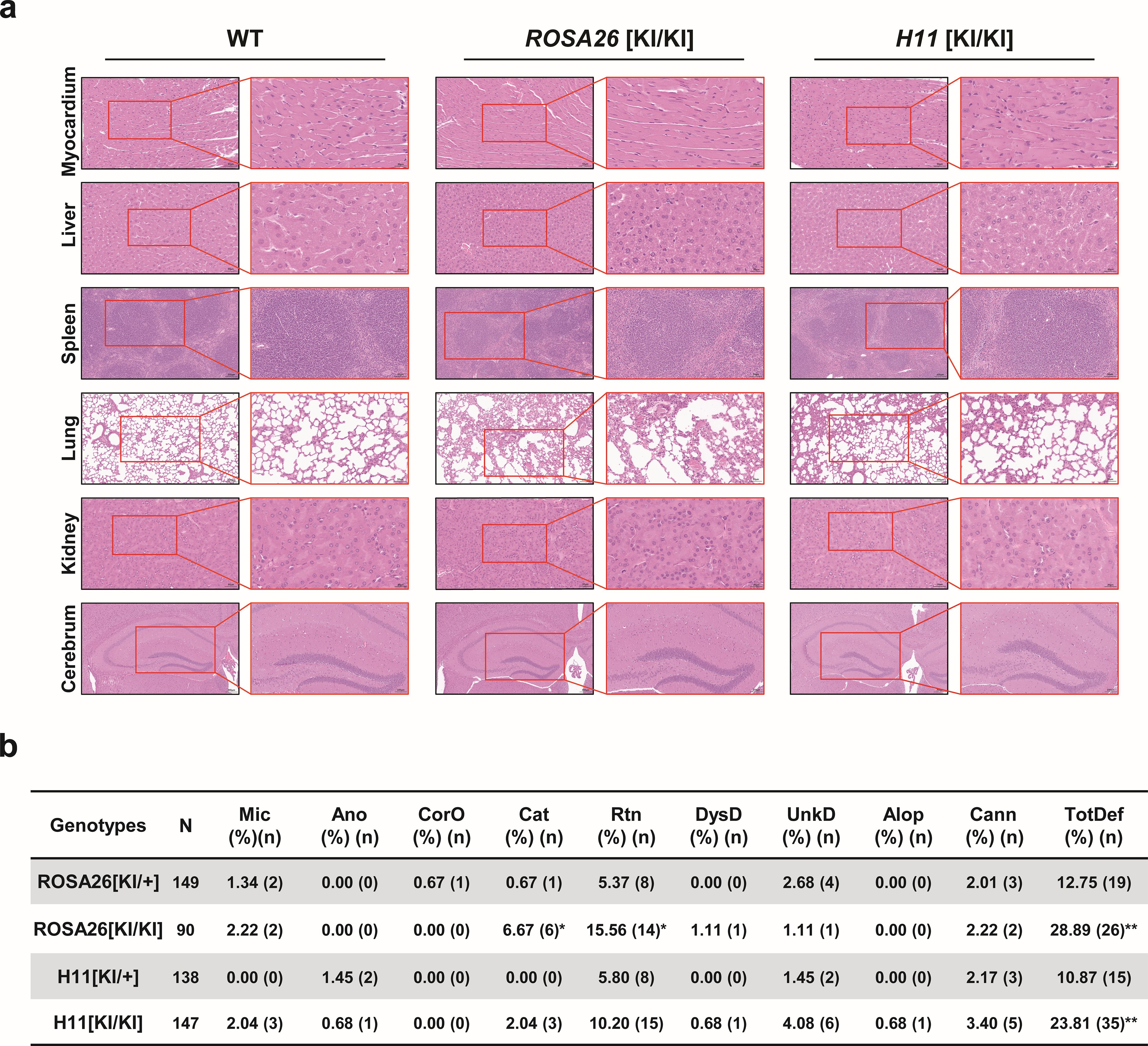 Figure 4. Histopathological and phenotypic assessment of ROSA26 and H11 knock-in mice. (a) Representative hematoxylin and eosin (H&E)-stained sections of myocardium, liver, spleen, lung, kidney, and cerebrum from wild-type (WT), ROSA26 [KI/KI], and H11 [KI/KI] mice. Tissues are displayed at two magnifications: spleen and lung (20×, scale bar: 20 μm; 40×, scale bar: 50 μm); myocardium, liver, kidney, and cerebrum (40×, scale bar: 20 μm; 100×, scale bar: 50 μm). Data represent three independent biological replicates. (b) Comprehensive phenotypic analysis comparing incidence rates (%) of developmental and behavioral phenotypes between heterozygous and homozygous mice: Microphthalmia (Mic), Anophthalmia (Ano), Corneal opacity (CorO), Cataract (Cat), Runting (Rtn), Dystocia-related death (DysD), Unexplained death (UnkD), Alopecia (Alop), Cannibalism (Cann), and Total defects (TotDef). Statistical significance (*P < 0.05, ** P < 0.01) was determined by χ² or Fisher’s exact test (applied when expected cell counts <5). Sample sizes: ROSA26 [KI/+] (n=149), ROSA26 [KI/KI] (n=90), H11 [KI/+] (n=138), H11 [KI/KI] (n=147).