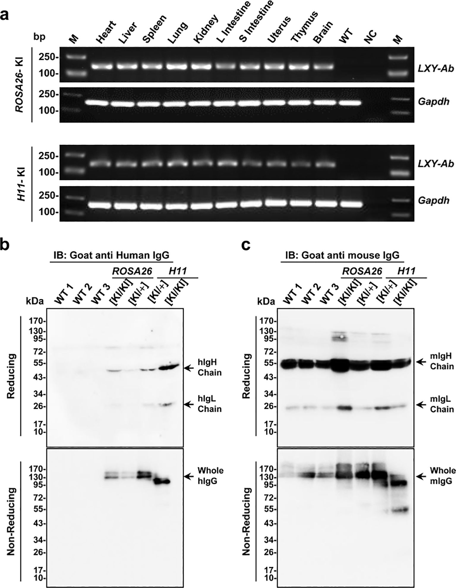 Figure 5. Tissue-specific expression and structural validation of full-human LXY-Ab in ROSA26 and H11 GE mice. (a) RT-PCR analysis of LXY-Ab mRNA expression across multiple tissues (heart, liver, spleen, lung, kidney, L intestine, S intestine, uterus, thymus, and brain) from ROSA26 and H11 homozygous knock-in mice. Amplification of the expected 180 bp product (LXY-Ab) and 150 bp GAPDH control confirmed tissue-wide transcription, with no signal in wild-type (WT) or no-template (NC) controls. M: DNA ladder. (b) Western blot under reducing conditions (goat anti-human IgG) detected LXY-Ab heavy chain (~55 kDa) and light chain (~25 kDa), with expression intensity correlating with zygosity (KI/KI > KI/+). Non-reducing conditions revealed intact IgG (~150 kDa). (c) Parallel blots probed with goat anti-mouse IgG verified endogenous murine IgG in all samples, excluding cross-reactivity. Molecular weight markers (kDa) are indicated. Each lane represents an independent biological replicate (WT1-3, ROSA26 [KI/KI], ROSA26 [KI/+I], H11 [KI/KI] and H11 [KI/+]).