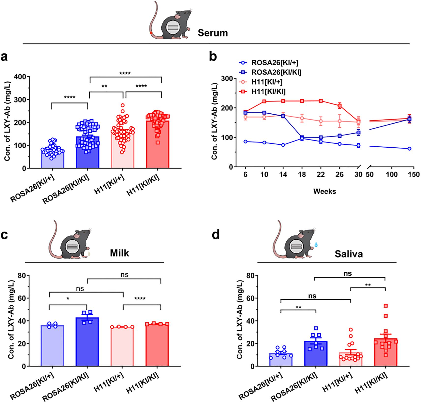 Figure 6. Systemic and sustained expression of SEB-specific monoclonal antibody LXY-Ab in GE mice. (a) Serum LXY-Ab concentrations in heterozygous (ROSA26 [KI/+], H11 [KI/+]) and homozygous (ROSA [KI/KI], H11 [KI/KI]) mice quantified by ELISA (6–12 weeks, n = 53–61). (b) Age-dependent serum antibody dynamics over 6–140 weeks (n = 9/timepoint/genotype) (c) Postpartum day-7 milk in lactating females (n = 4/genotype) and (d) Stimulated saliva antibody concentrations across genotypes (n = 7–14). Data represent mean ± SEM. Statistical significance was determined by two-way ANOVA with Tukey’s post hoc test (*P<0.05, **P<0.01, ****P< 0.0001; ns = not significant).