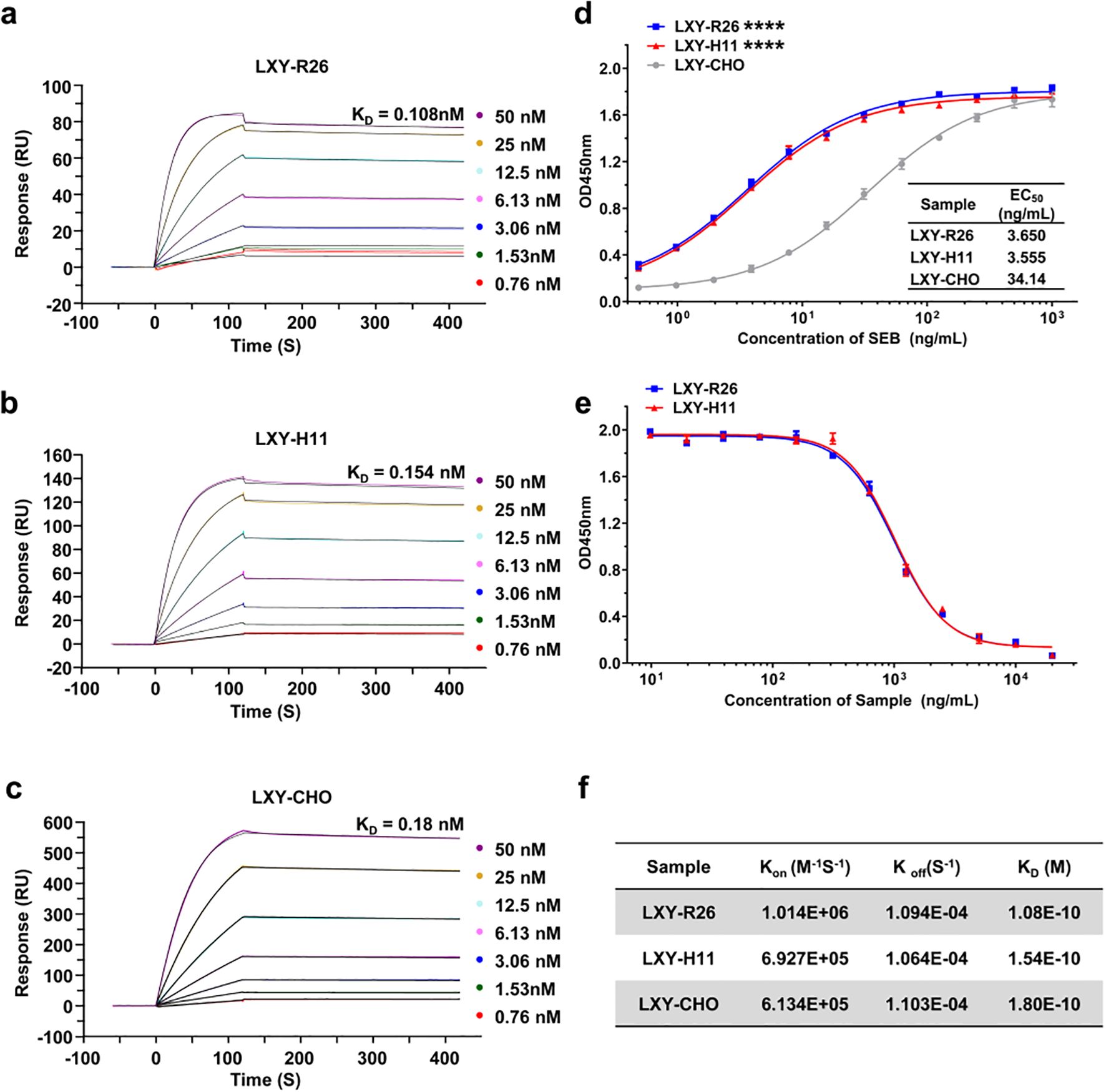 Figure 7. Functional characterization of LXY-Ab affinity and specificity across transgenic and CHO-derived sources. (a–c) Surface plasmon resonance (SPR) sensorgrams of SEB-binding kinetics for LXY-Ab derived from homozygous ROSA26 [KI/KI] serum (LXY-R26, (a), H11 [KI/KI] serum (LXY-H11, (b), and CHO-purified antibody (LXY-CHO, (c). Anti-human Fc antibody was immobilized on a CM5 chip to capture LXY-R26, LXY-H11, or LXY-CHO, followed by SEB analyte injection (120 s association, 300 s dissociation). (d) ELISA dose-response curves binding to SEB comparing SEB-binding efficacy, with half-maximal effective concentrations (EC50) indicated (mean ± SEM, n = 3 independent replicates). (e) Competitive ELISA using biotinylated LXY-CHO, showing concentration-dependent inhibition by serum antibodies from both transgenic lines, confirming conserved epitope targeting. (f) Summary of kinetic parameters (Kon, Koff, KD) for all groups. ****P < 0.001 vs. LXY-CHO group.