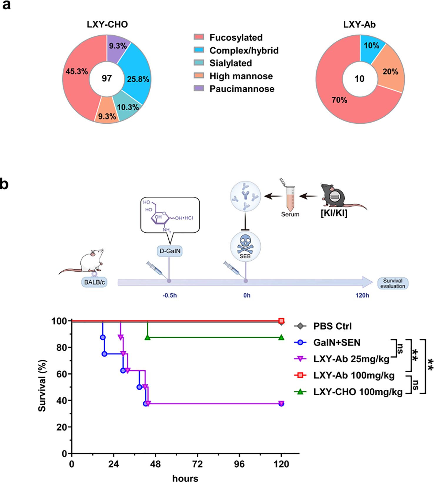 Figure 8. Glycan profiling and protective efficacy of GE mouse serum in SEB-induced toxic shock. (a) Comparative N-glycan profiling of LXY-Ab purified from GE mouse serum versus CHO cell-derived antibody. Percentages indicate the relative abundance of distinct glycoforms. (b) Schematic of the LD50 toxic shock model: BALB/c mice were sensitized with (D-GalN, 1 g/kg) followed by SEB (0.25 mg/kg). Survival kinetics of mice therapeutically treated (0 h) with transgenic serum [KI/KI] containing LXY-Ab (25 mg/kg, 100 mg/kg) or CHO-purified LXY-Ab (100 mg/kg). Untreated controls (D-GalN + SEB) and PBS-treated mice were included (n=8/group). Survival was monitored for 120 h post-SEB challenge. Data represent mean ± SEM from three independent experiments. Statistical significance was determined by log-rank test (**P<0.01, ns = not significant).