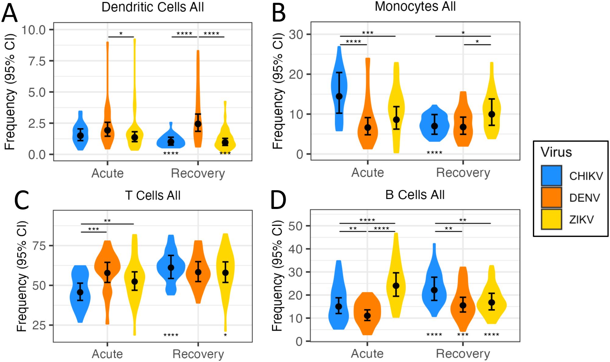 Figure 1. Quantification of immune-cell frequencies following arbovirus infection. Violin plots (A-D) show distribution of immune-cell frequencies across patients during acute infection with CHIKV, DENV and ZIKV, as well as during infection recovery. Black circles indicate the mean immune-cell frequency ±95% confidence interval (CI). Asterisks above points indicate significant (FDR<0.05) frequency differences between viruses, whilst asterisks below points indicate significant frequency change from acute infection to recovery. *p<0.05; **p<0.01; ***p<0.001; ****p<0.0001.
