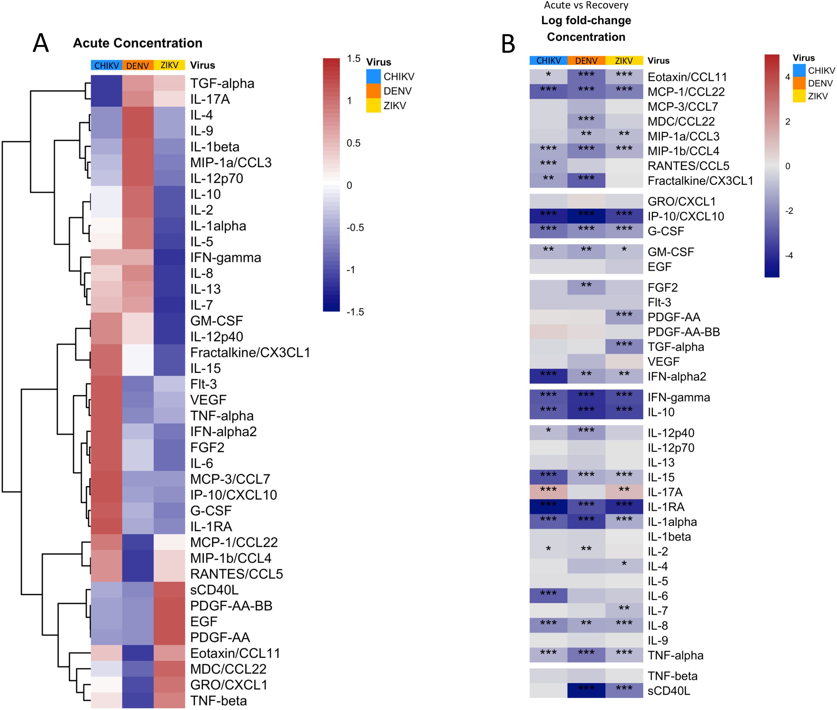 Figure 2. Quantification and clustering of cytokine/chemokine/growth factor concentrations during acute arbovirus infection and transition towards recovery. (A) Heatmap showing average concentrations of cytokines/chemokines/growth factors during acute infection, scaled and centered so that 0 (white) is the mean concentration of each protein and 1 (red) and -1 (blue) represent 1 standard deviation (SD) above or below the average, respectively. The heatmap is clustered by row to group proteins with similar concentration profiles. (B) Heatmap showing the average log fold-change in protein concentration from acute infection to recovery for each protein. Asterisks indicate significant (FDR < 0.05) concentration change, with *p<0.05; **p<0.01; ***p<0.001; ****p<0.0001. Rows are grouped by ‘protein-type’ as indicated.
