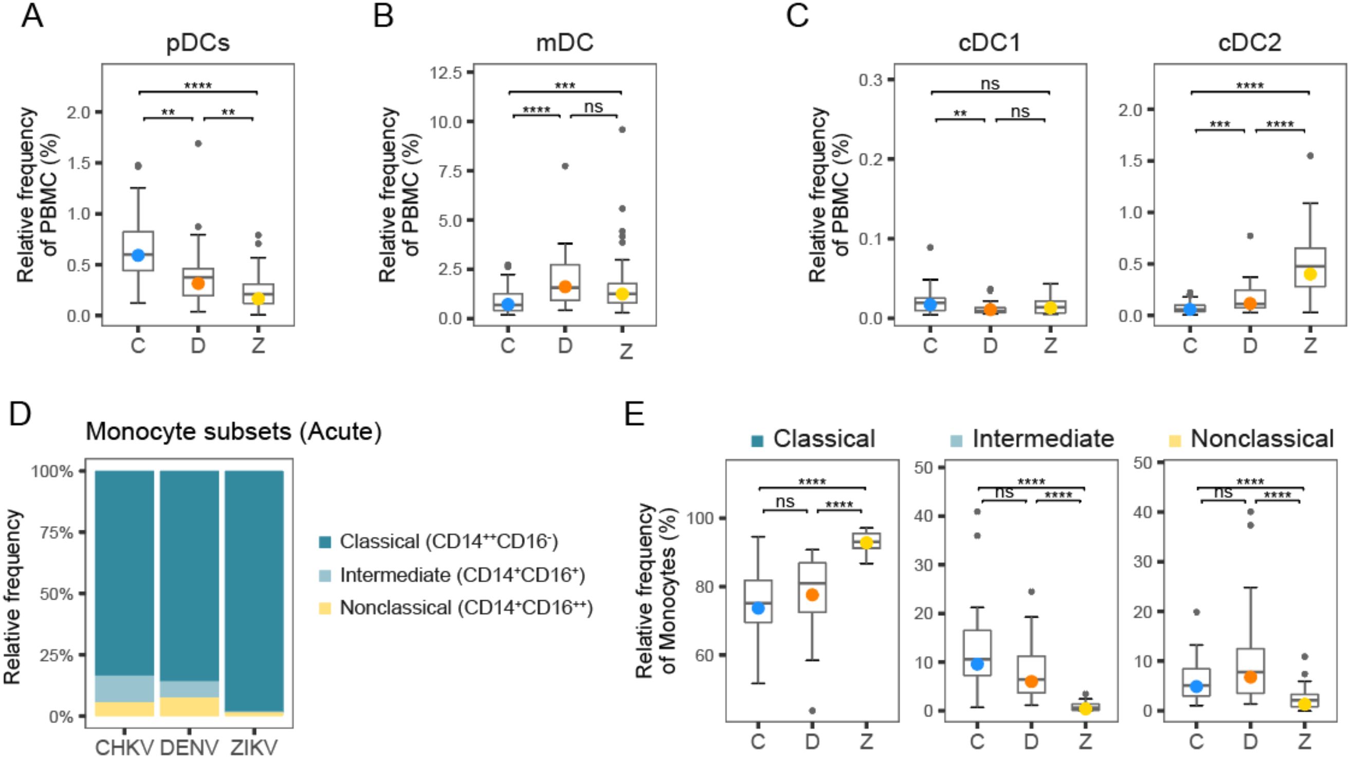 Figure 3. Frequency of DC and monocyte subtypes following arbovirus infection. (A-C) Box plots show distribution of DC subtype frequencies across patients during acute infection with CHIKV (C), DENV (D), and ZIKV (Z). (D) Stacked bar plot shows relative proportions of classical, intermediate, and non-classical monocytes during acute infection with CHIKV, DENV and ZIKV. (E) Box plots show distribution of monocyte subtype frequencies across patients during acute infection with CHIKV, DENV and ZIKV. Colored circles, as in (A-C, E), indicate the mean frequency; asterisks indicate significant (FDR<0.05) differences between viruses. *p<0.05; **p<0.01; ***p<0.001; ****p<0.0001. ns, not significant.