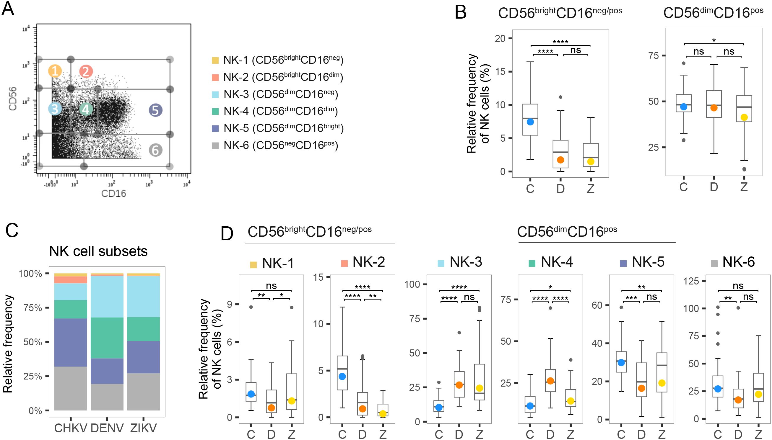 Figure 4. Frequency of NK cell subtypes during acute infection with CHIKV, DENV and ZIKV. (A) Scatter plot for a representative PBMC sample shows fluorescence of CD16 and CD56 measured by mass-cytometry. NK cell subtypes 1–6 are indicated. (B) Box plot shows distribution of the two canonical compartments within total NK cells: CD56brightCD16neg/pos (left) and CD56dimCD16pos (right) during acute infection with CHIKV (C), DENV (D), and ZIKV (Z). (C) Stacked bar plot shows the percentage of NK cell subtypes within the NK cell compartment during acute infection with CHIKV, DENV and ZIKV. (D) Box plots show the percentage of NK cell subtypes within the NK cell compartment during acute infection with CHIKV, DENV and ZIKV. Colored circles, as in B and D, indicate the mean frequency; asterisks indicate significant (FDR<0.05) differences between viruses. *p<0.05; **p<0.01; ***p<0.001; ****p<0.0001. ns, not significant.