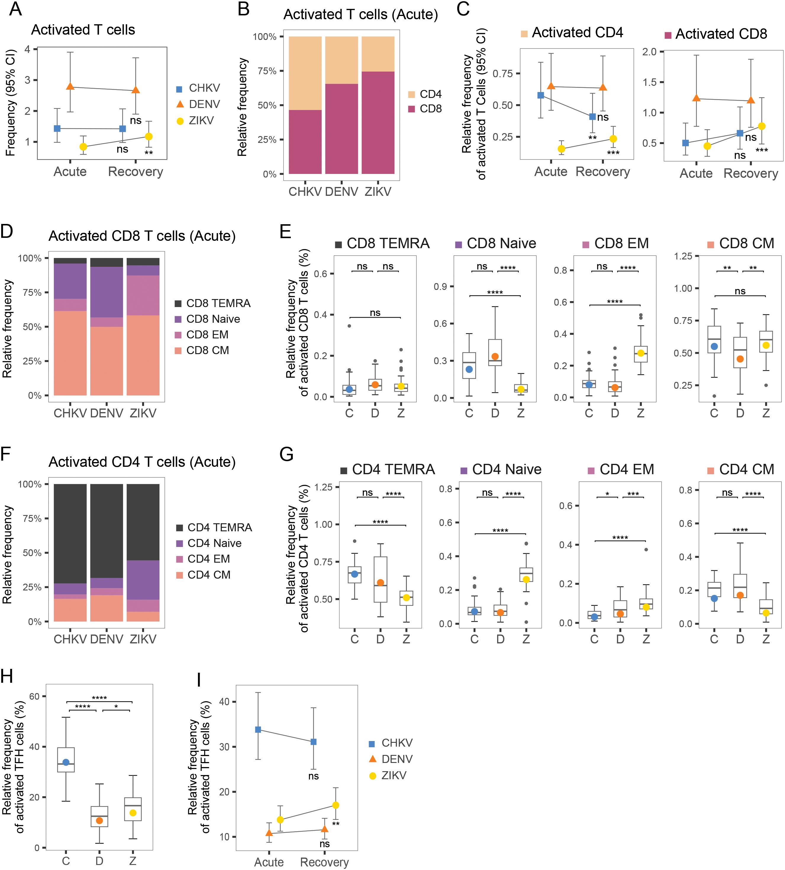 Figure 5. T-cell composition during acute infection with CHIKV, DENV and ZIKV and recovery. (A) Scatter plots show mean frequency (+95% CI) of activated T cells within the T-cell compartment during acute infection and recovery. (B) Bar plot shows proportions of CD4+ and CD8+ T cells within the activated T-cell compartment. (C) Scatter plots show mean frequency (+95% CI) of activated CD4+ and activated CD8+ cells, within the activated T-cell compartment, during acute infection and recovery. (D) Stacked bar plot shows relative proportions of Naïve, TEMRA, EM and CM cells within the activated CD8+ T-cell compartment. (E) Box plot shows the distribution of Naïve, TEMRA, EM and CM CD8+ T cells within the activated CD8+ T-cell compartment during acute infection with CHIKV (C), DENV (D), or ZIKV (Z). (F) Stacked bar plot shows relative proportions of Naïve, TEMRA, EM and CM cells within the active CD4+ T-cell compartment. (G) Box plot shows the distribution of Naïve, TEMRA, EM and CM CD8+ T cells within the activated CD4+ T-cell compartment, during acute infection with CHIKV (C), DENV (D), or ZIKV (Z). (H) Box plots show relative frequency of activated T-follicular-helper (Tfh) cells (% of helper-cell compartment) during acute infection with each virus. (I) Scatter plots show relative frequency of activated Tfh cells (% of helper-cell compartment) during acute infection and recovery for each virus. Colored symbols, as in (A, C, I), indicate the mean frequency; asterisks indicate significant (FDR<0.05) frequency change from acute infection to recovery (A, C, I) or significant differences between viruses (E, G, F). *p<0.05; **p<0.01; ***p<0.001; ****p<0.0001. ns, not significant.