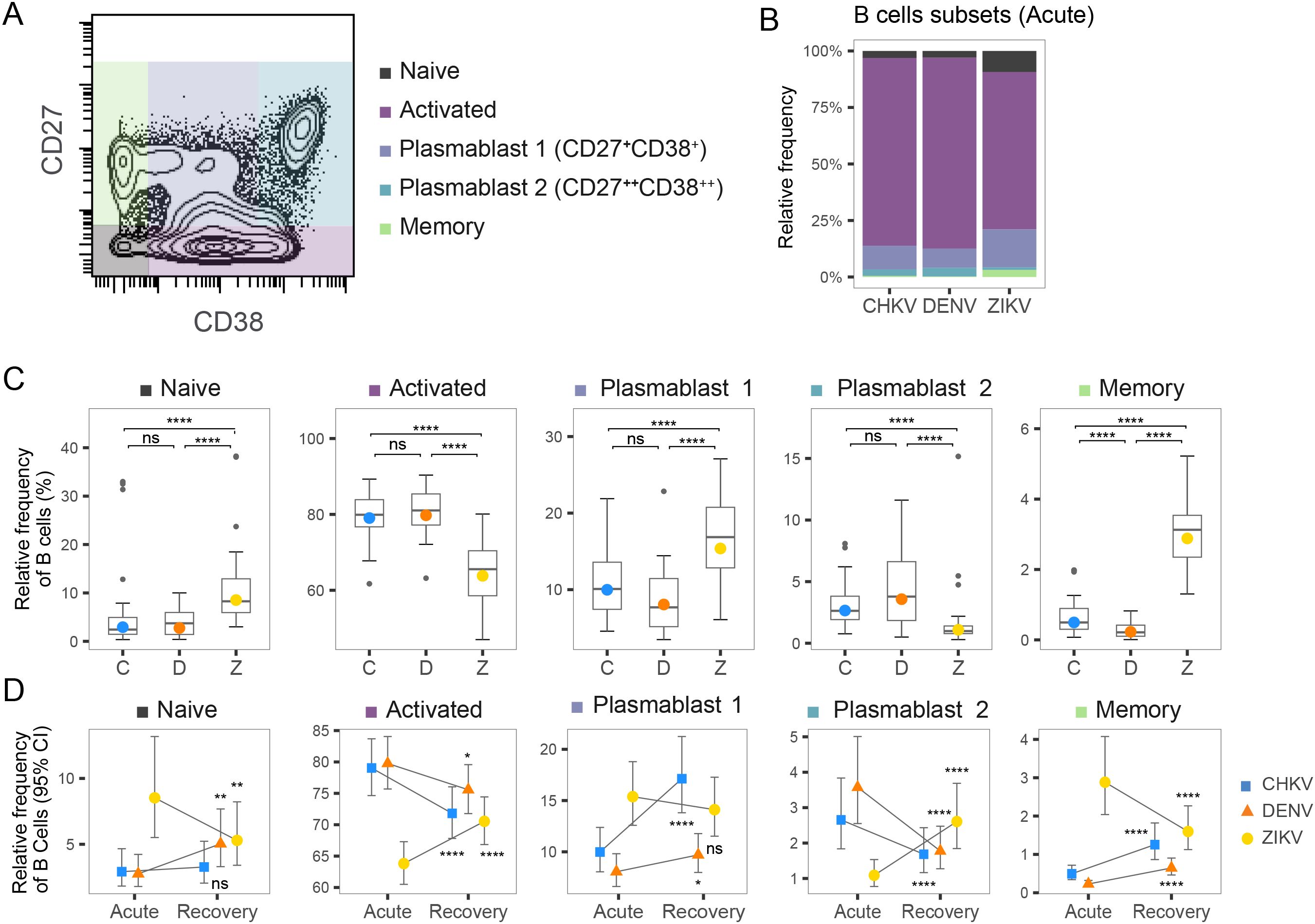 Figure 6. Frequency of B-cell subtypes following arbovirus infection. (A) Contour plot of distribution of CD27 and CD38 CyTOF signal across a representative PBMC sample. Colored regions indicate Naïve, Activated, Plasma 1, Plasma 2 and Memory B cells. (B) Stacked bar graph shows relative frequency of B-cell subtypes within the activated B-cell compartment during acute infection with CHIKV, DENV, or ZIKV. (C) Box plot shows the distribution of indicated Naïve, Activated, Plasma 1, Plasma 2 and Memory B cells within the active B-cell compartment during acute infection with CHIKV (C), DENV (D), or ZIKV (Z). Colored circles indicate the mean frequency; asterisks indicate significant (FDR<0.05) differences between viruses. (D) Scatter plots show mean frequency (+95% CI) of B-cell subtypes within the B-cell compartment during acute infection and recovery. Asterisks indicate significant (FDR<0.05) frequency change from acute infection to recovery. *p<0.05; **p<0.01; ***p<0.001; ****p<0.0001. ns, not significant.