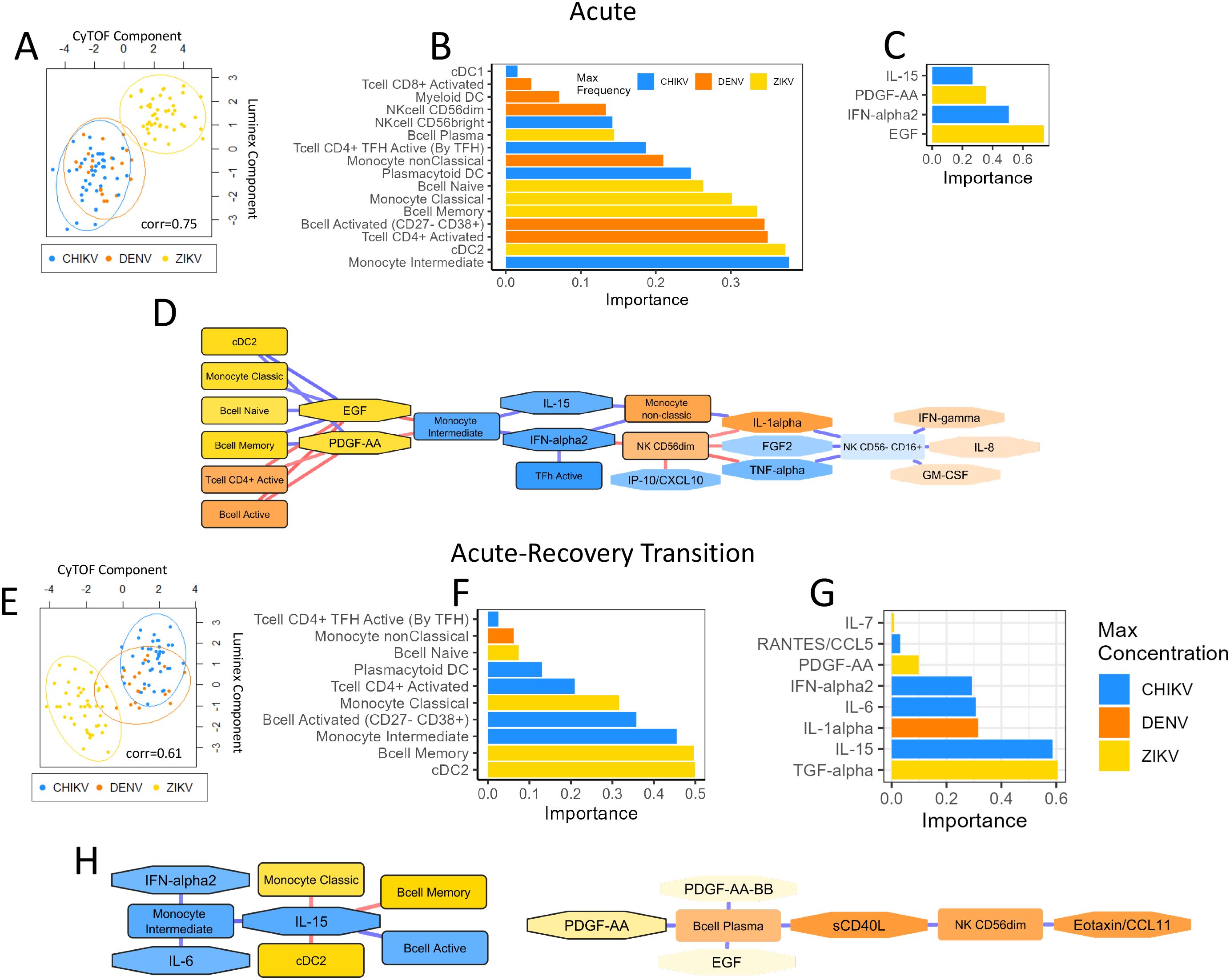 Figure 7. Multi-omic analysis of cytokine/chemokine/growth factors and immune-cell profiles during acute infection and acute-recovery transition. Plots summarize the multi-omic DIABLO analysis of inflammatory proteins and immune-cell profiles during acute infection (A-D) and the acute-recovery transition (E, F). Scatter plots (A, E) show Luminex and CyTOF component scores for each sample. Samples that are closer together have more similar Luminex and CyTOF profiles. Data points are colored by virus type for each sample. The correlation score indicates the Pearson’s correlation between each component. Bar plots (B, C, F, G) show the weights (importance) of each feature in the DIABLO analysis; these ‘important’ features explain most of the variation between each virus type. The color of each bar indicates the virus showing the highest expression of that feature. Network diagrams (D, H) show Pearson’s correlation between each feature (nodes). The strength and direction of the correlation is indicated by the color of each edge (blue=up, red=down). Only features with correlation >0.7 are shown. The color of each node indicates the virus that showed highest expression of that feature. ‘Important’ features are highlighted with a black boarder.