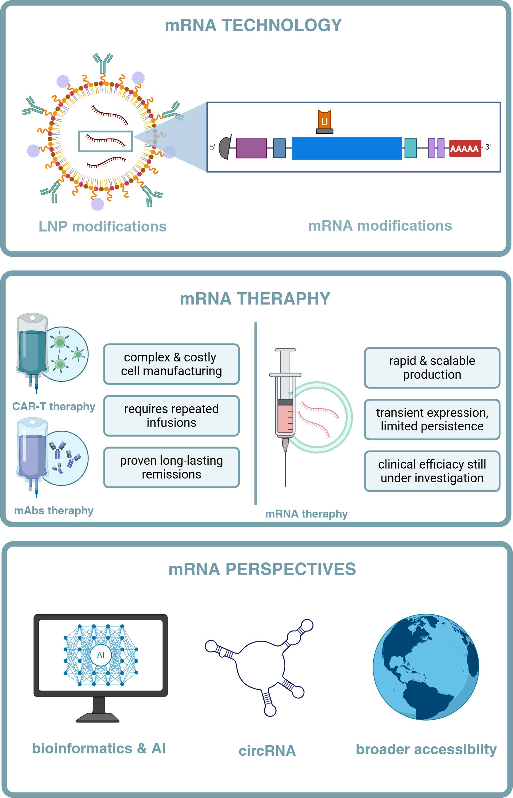 One innovative therapeutic approach of immunotherapy is the use of mRNA technology. Following the success of in vitro transcribed (IVT)-mRNA-based coronavirus disease 2019 (COVID-19) vaccines, IVT-mRNA therapeutics have gained significant traction within the biopharmaceutical field. Due to their capacity for rapid production, personalization, and strong reactogenicity, IVT-mRNA applications are now being explored in oncology. Current applications of IVT-mRNA-based therapeutics in oncology can be categorized into four main areas: (1) IVT-mRNA vaccines designed to elicit immune responses against tumor-specific antigens, (2) IVT-mRNA-encoded monoclonal antibodies that enable transient in vivo production of antibodies, (3) IVT-mRNA-engineered chimeric antigen receptor (CAR)-T cell therapies, where IVT-mRNA is used to transiently express chimeric antigen receptors in T cells, and (4) IVT-mRNA coding for functional proteins, such as cytokines, immune checkpoint inhibitors, or pro-apoptotic factors, aimed at modulating the tumor microenvironment or directly inducing tumor cell death (10).