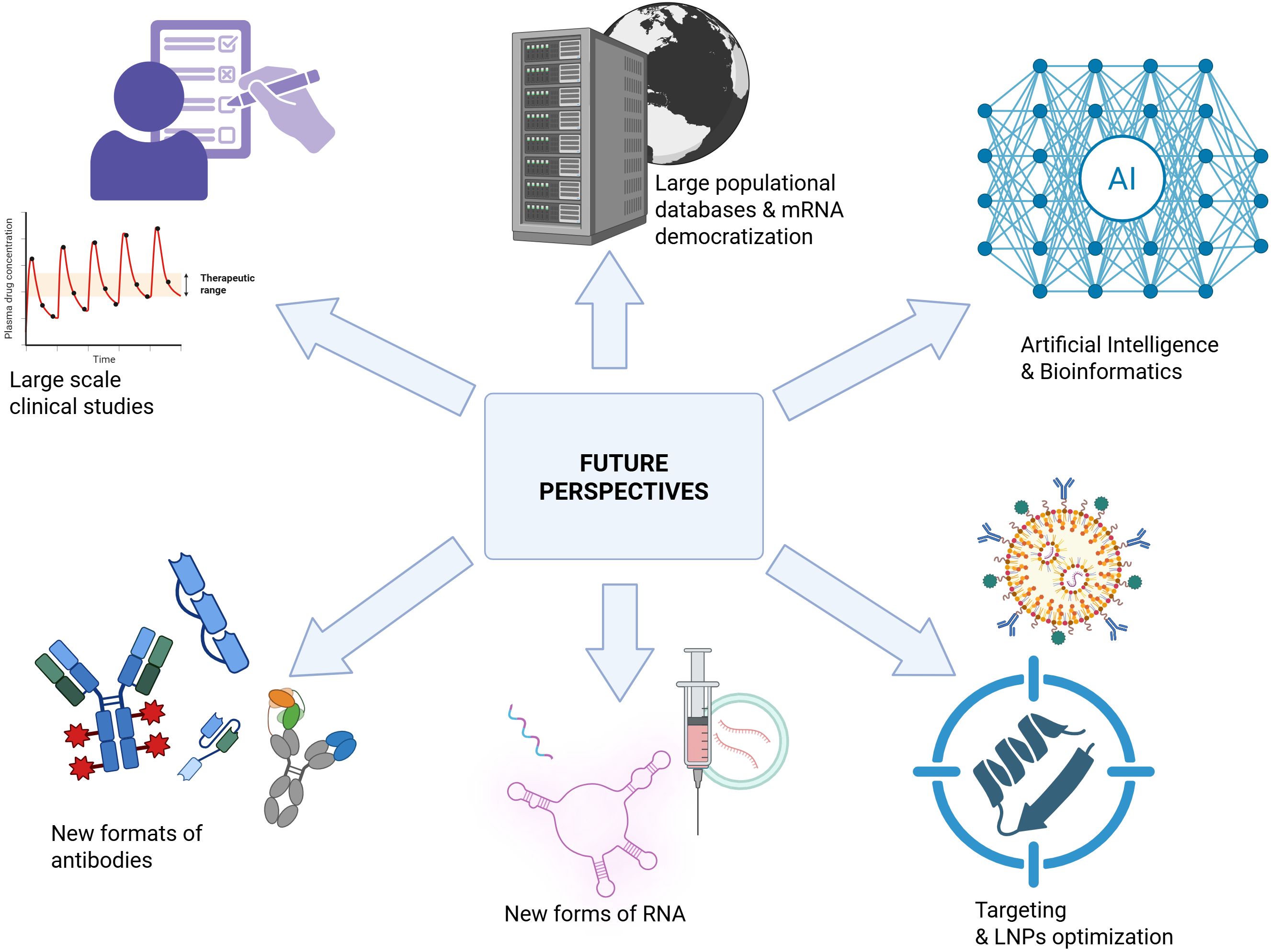 In light of these challenges, IVT-mRNA technology emerges as a simple and elegant solution, offering the potential to overcome the limitations of protein-based monoclonal antibody therapies. The drawbacks of protein storage and administration can be bypassed by delivering the genetic information encoding the antibody, enabling the patient’s body to produce its own therapeutic protein (74, 75). This approach could significantly reduce production, storage, and treatment costs, thereby expanding access to advanced therapies for underserved populations and developing countries where access to costly treatments is limited or nonexistent (76–78).