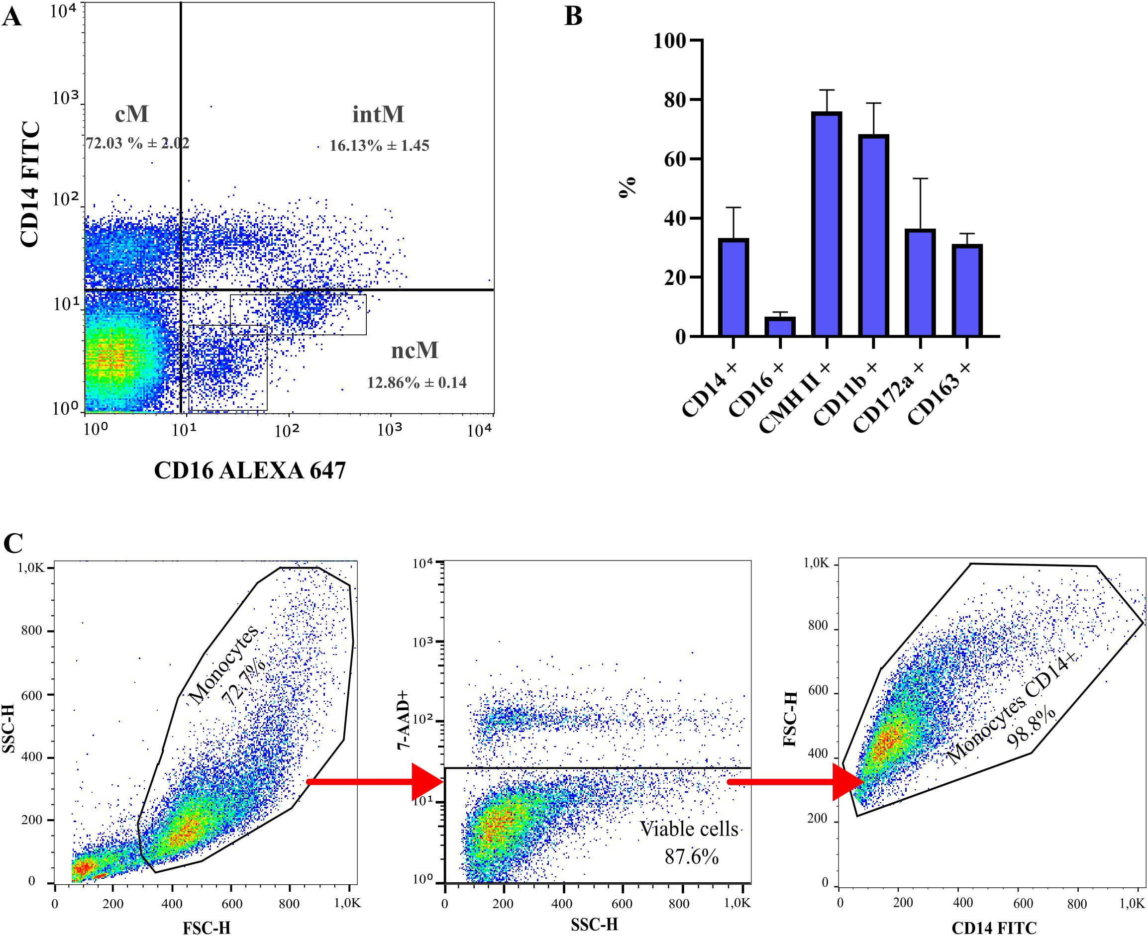 Panel A shows a flow cytometry plot of CD14 FITC versus CD16 ALEXA 647, indicating classic monocytes (cM), intermediate monocytes (intM), and non-classic monocytes (ncM) with percentages. Panel B is a bar graph displaying percentages of various cell markers like CD14, CD16, CMH II, CD11b, CD172a, and CD163. Panel C consists of three flow cytometry plots: the first identifies monocytes by SSC-H and FSC-H with a percentage, the second isolates viable cells marked 7-AAD positive, and the third highlights monocytes marked CD14 positive with a percentage.