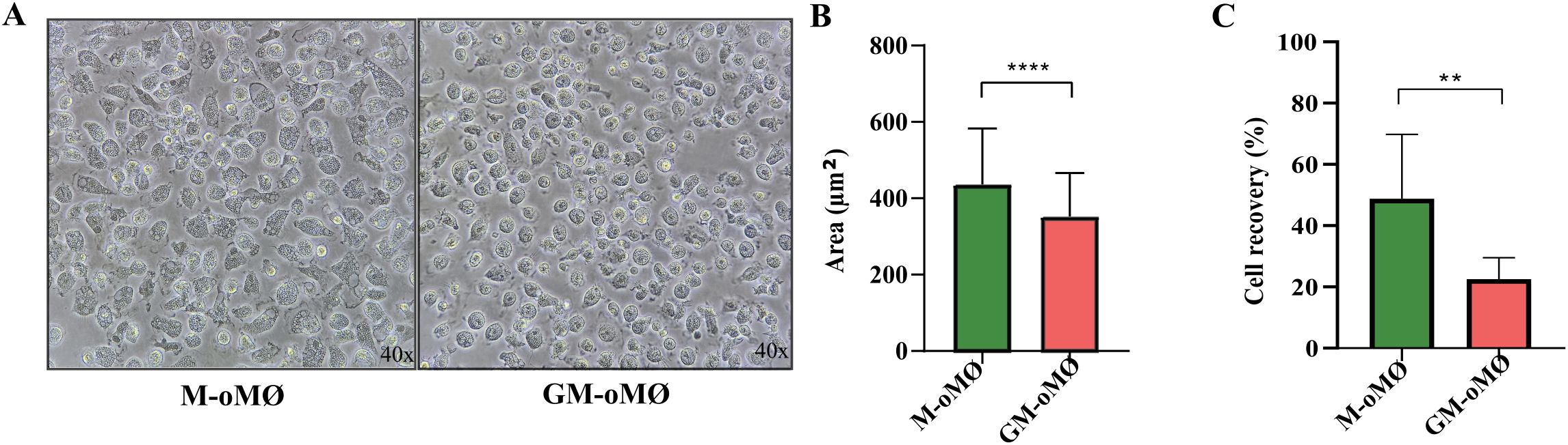 Microscopic images in panel A display morphology of M-oMØ and GM-oMØ at 40x magnification. Panel B shows a bar chart comparing the area of these two cell groups, with M-oMØ having a larger area. Panel C presents a bar chart of cell recovery percentage, illustrating higher recovery for M-oMØ. Significant differences are indicated with asterisks.