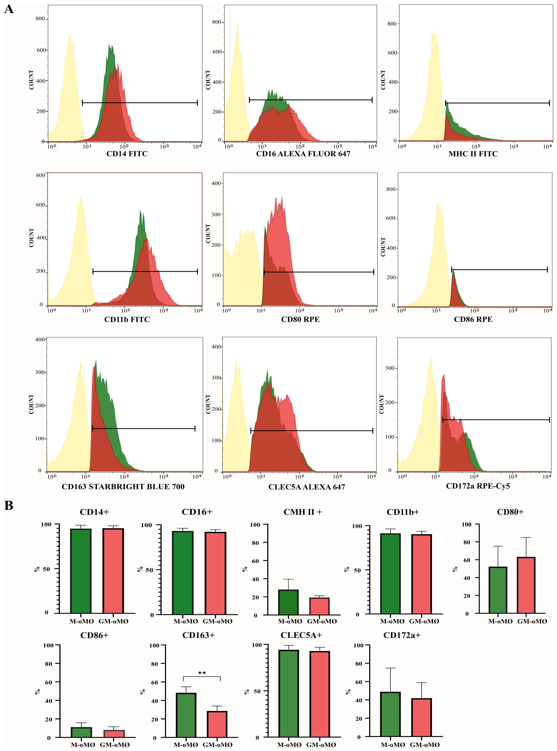 Figure 3. Flow cytometric analysis of M- and GM-oMØs. (A) Histograms represent the percentage of positive cells and mean fluorescence intensity (MFI) of CD14, CD16, MHC class II, CD11b, CD80, CD86, CD172a, CD163 and CLEC5A markers, as determined by flow cytometry in non-stimulated oMØ after 7 days of culture with GM-CSF (red) or M-CSF (green). Autofluorescence of unstained oMØs is represented in yellow. Histograms are representative of three independent experiments. (B) Difference in expression markers in M- and GM-oMØs. Data are presented as mean percentage (%) ± SD. **p<0.01.