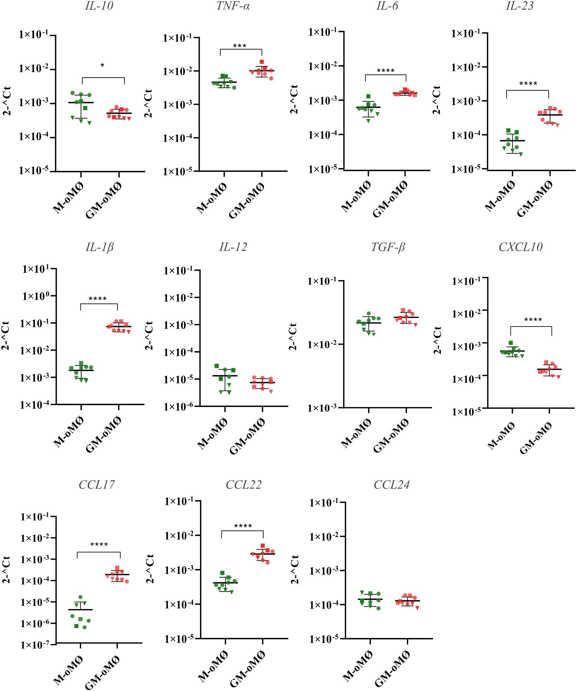 Twelve scatter plots compare the expression of IL-10, TNF-a, IL-6, IL-23, IL-1b, IL-12, TGF-b, CXCL10, CCL17, CCL22, and CCL24 between  M-oMØ  and GM-oMØ. Significant differences are marked with asterisks, indicating varying levels of statistical significance. Data points are shown with error bars representing the standard deviation for each group.