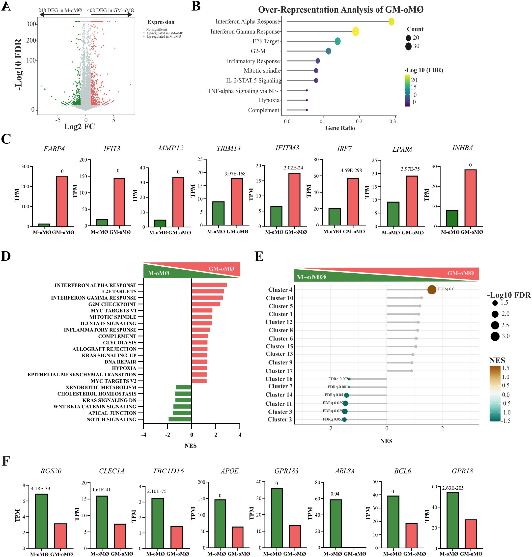 Scientific data visualization compares gene expression between M-oMØ  and GM-oMØ. Panel A is a volcano plot showing differentially expressed genes. Panel B shows pathway enrichment with gene ratio and count in a dot plot. Panel C displays bar graphs of TPM values for several genes. Panel D presents normalized enrichment scores for various pathways in a bar chart. Panel E shows a dot plot with cluster analysis and NES values. Panel F contains bar graphs of additional gene expression comparisons.
