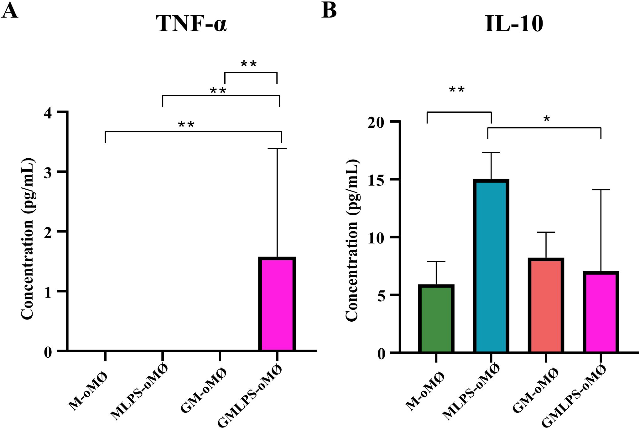 Bar graphs comparing concentrations of TNF-alpha and IL-10 across four conditions: M-oMØ, MLPS-oMØ, GM-oMØ, and GMLPS-oMØ. TNF-alpha levels (A) show significant differences among groups, with marked significance levels (**). IL-10 levels (B) also display significant differences, with significance indicated as ** and *. Bars represent concentration in picograms per milliliter with error bars.