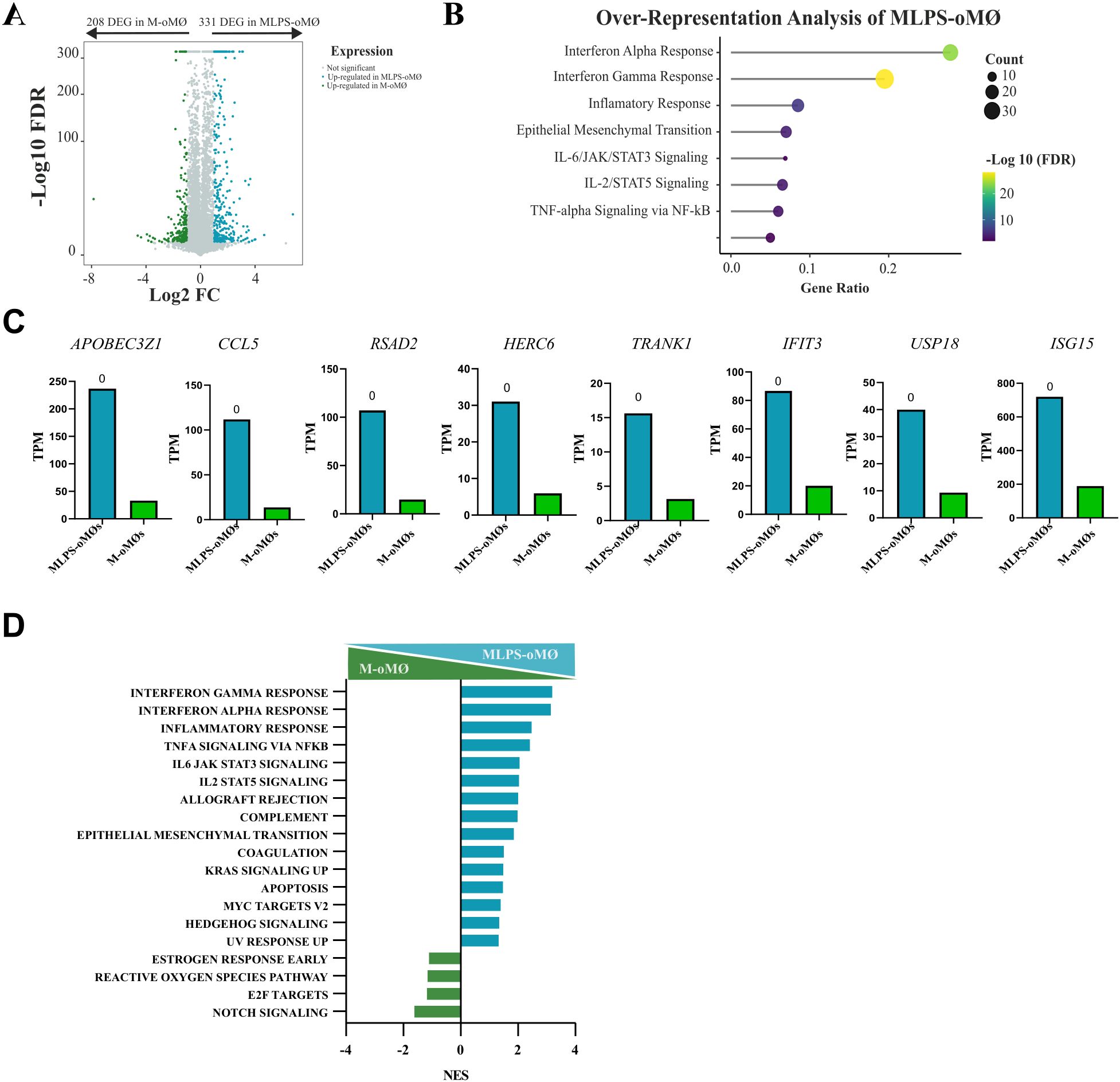 Figure 7. Transcriptional analysis of LPS-activated and unstimulated oMØs. (A) Volcano plot represents DEGs in LPS-stimulated M-oMØs (MLPS-oMØs, blue) and unstimulated M-oMØs (green) (|Log2 FC| ≥ 1, Q value ≤ 0.05) with a square transformation applied to the y-axis. (B) Enrichment analysis of DEGs in MLPS-oMØs. Dot size indicates the number of DEGs in each term, and the color gradient represents the -Log 10 (FDR). (C) Relative mRNA levels (TPM) of selected DEGs in MLPS-oMØs as determined by RNA-Seq on three independent samples. Q-value is shown in each case. (D) GSEA of Hallmark gene sets based on the transcriptomes of MLPS-oMØs and M-oMØs. NES are indicated for each gene set.